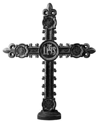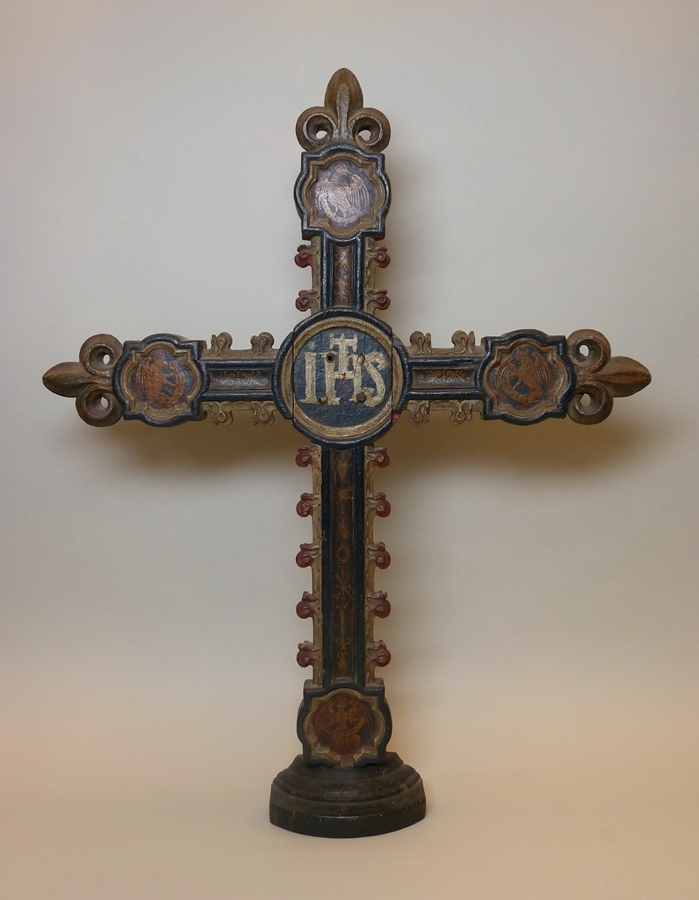 De kruisarmen zijn aan de uiteinden versierd met vierpassen. De bovenste drie kruisarmen eindigen in Franse lelies. In het midden een rond medaillon. In het vlakke middengedeelte van de geprofileerde vierpassenn zijn de vier evangelistensymbolen weergegeven. Bovenaan Johannes, onderaan Matheus, links Lucas en rechts Marcus. In de holle middenvelden van de geprofileerde kruisarmen zijn rankendecoraties ...