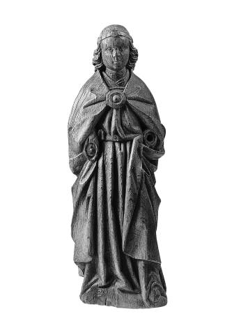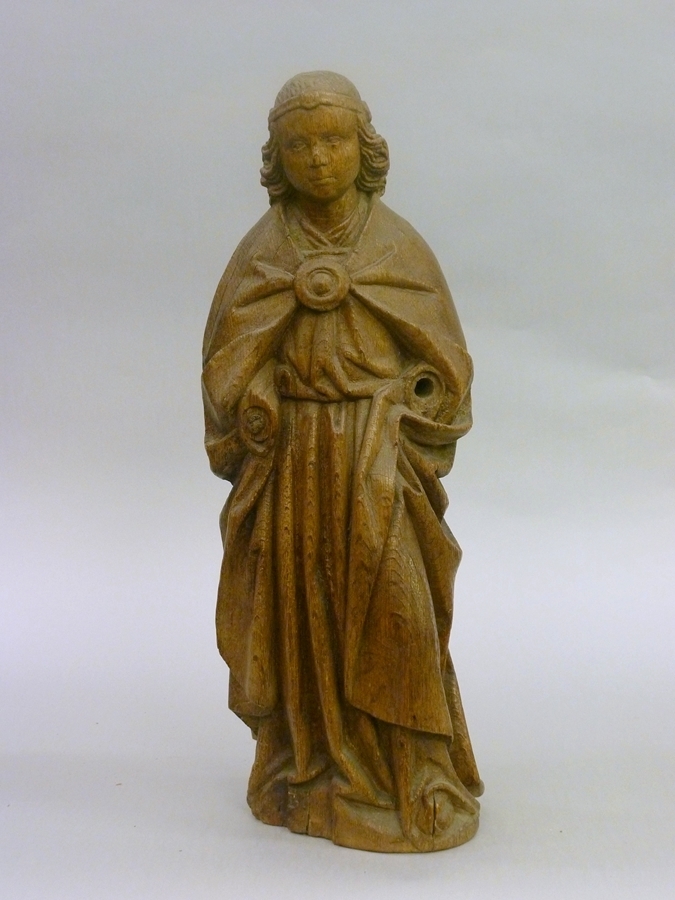 De engel is frontaal afgebeeld, met vooruitgeschoven linkervoet. Hij heeft beide armen gebogen. De linker is iets meer gekromd dan de rechter. Hij is gekleed in een gegord gewaad met amict en een pluviale met grote ronde agraaf. De pluviale heeft hij opgenomen beide armen. Om het hoofd een band met ronde versieringen. Techniek: Aan ...