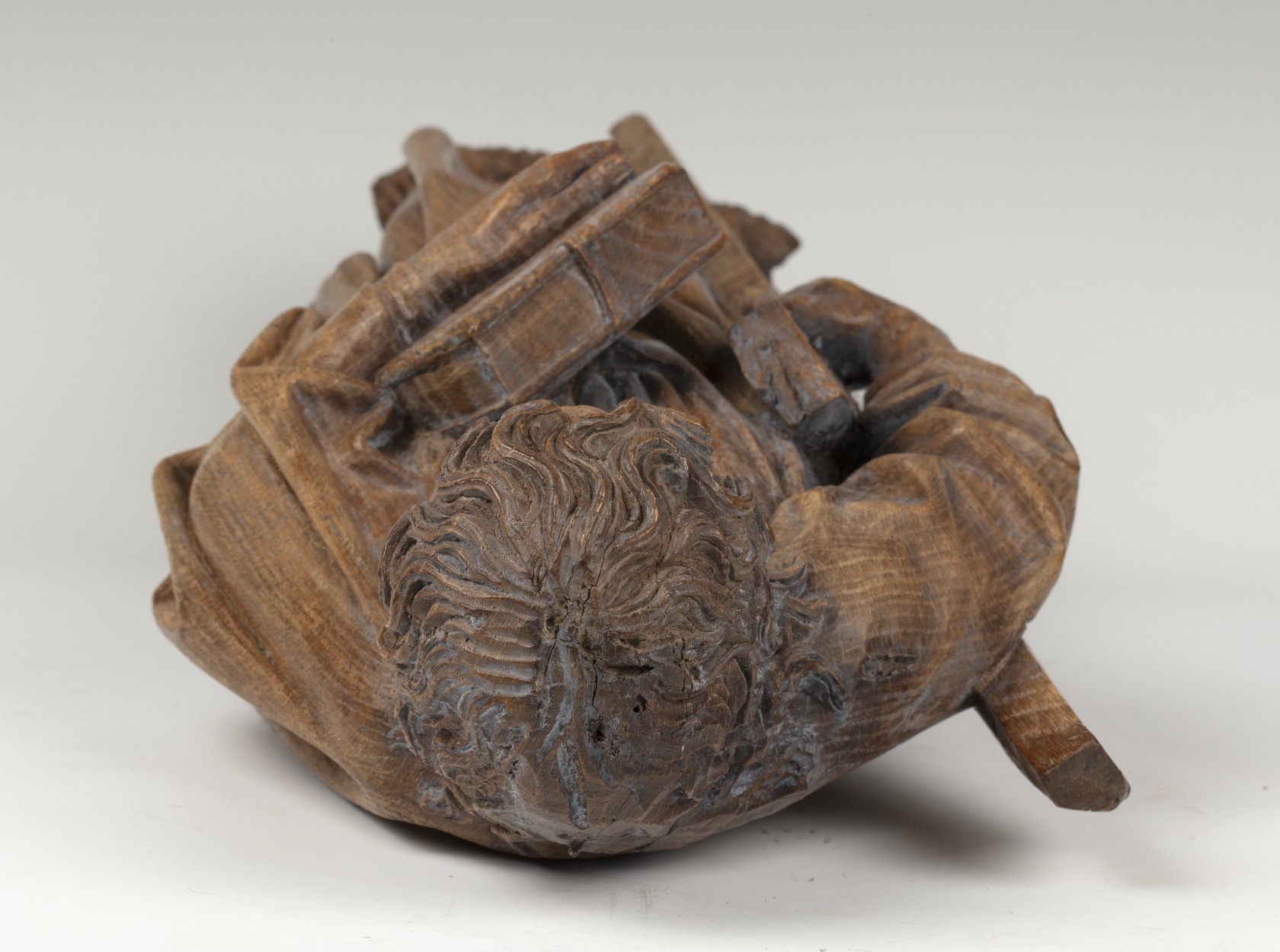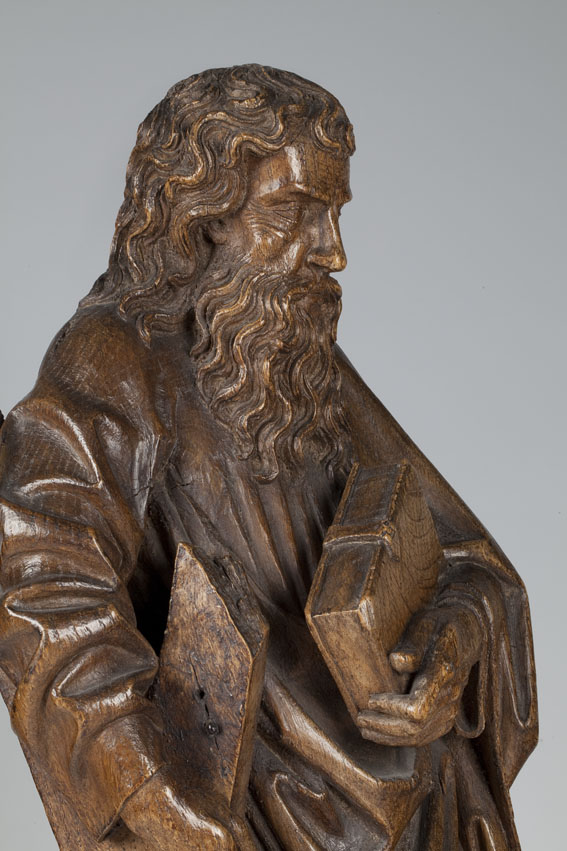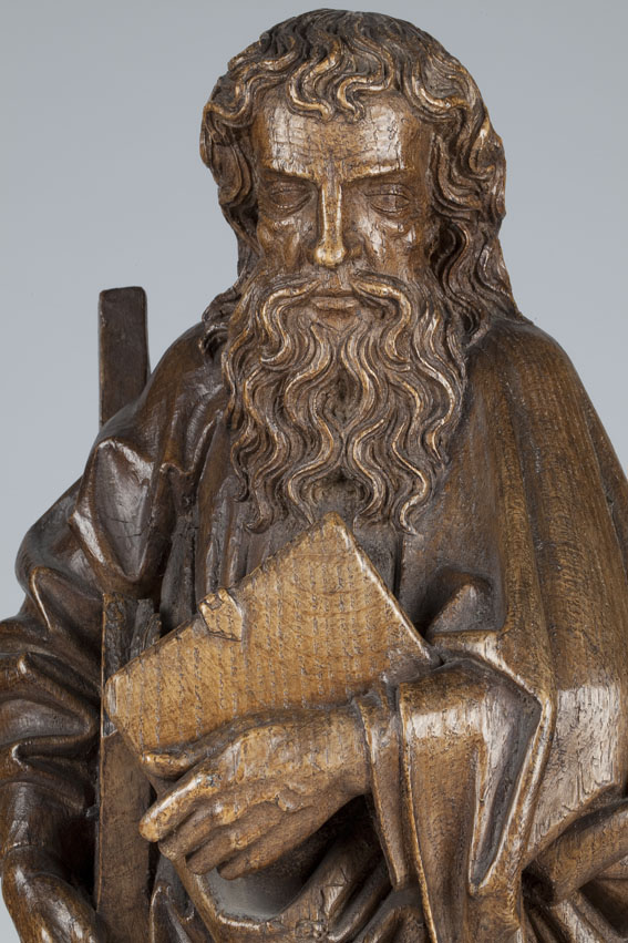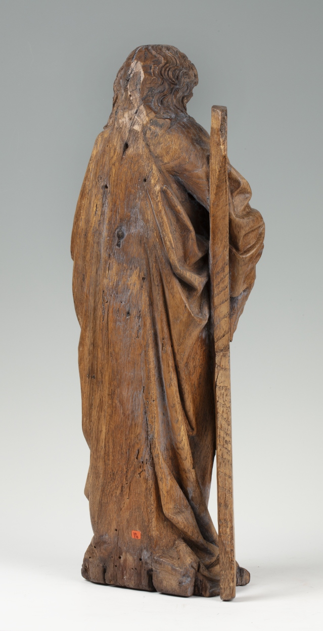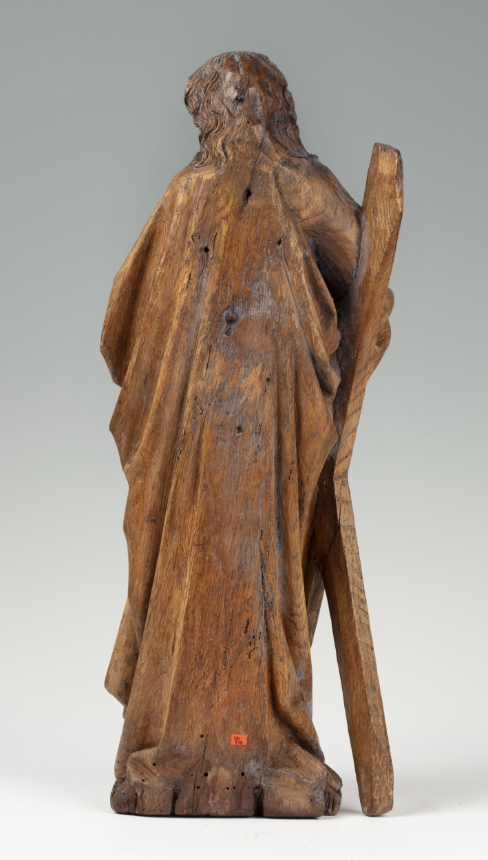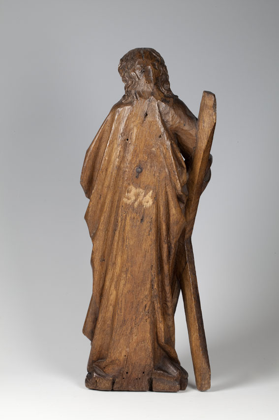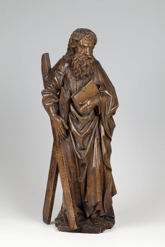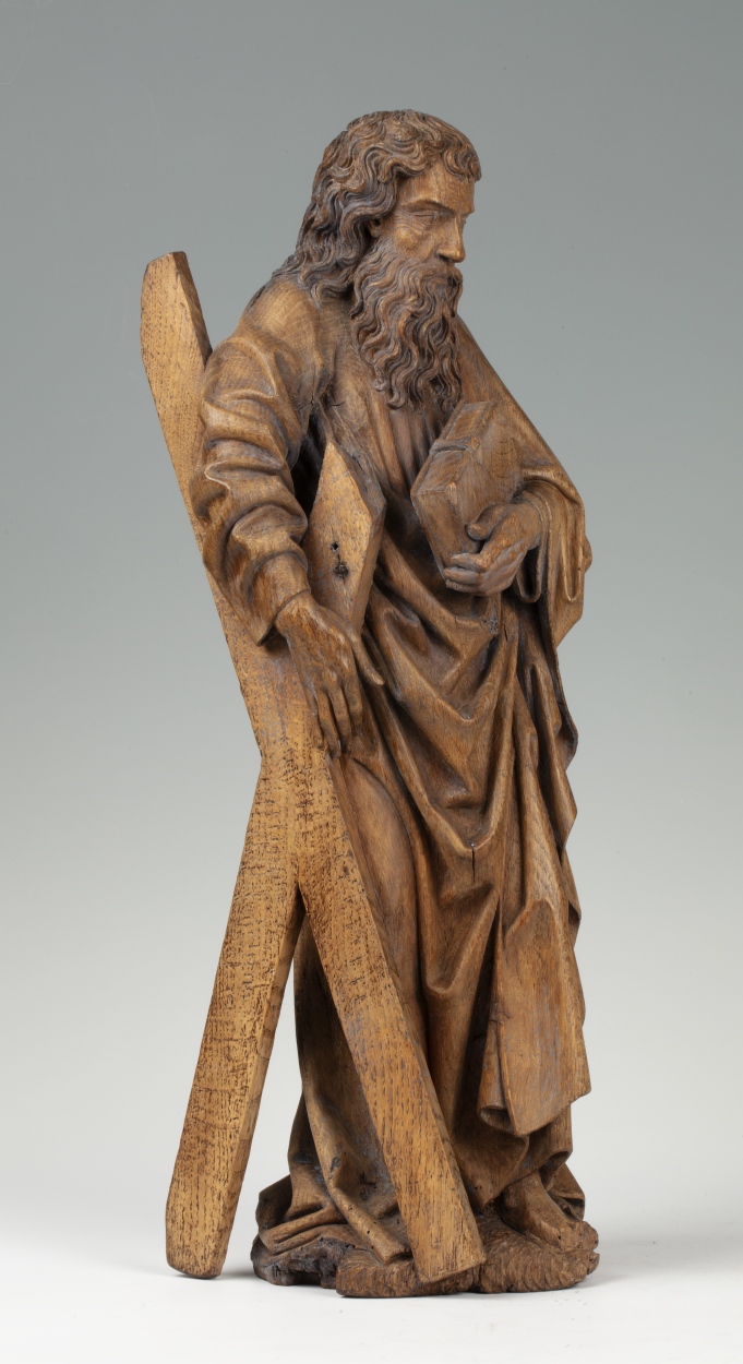 Andreas is staande voorgesteld, rustend op zijn rechterbeen. Hij heeft zijn hoofd iets gebogen en naar rechts gewend. Onder zijn rechterarm klemt hij zijn attribuut, het diagonale kruis, en in de linkerhand draagt hij een boek met sluitklamp. Zijn gelaat is zeer gedetailleerd uitgewerkt. De kraaienpootjes bij de vrij kleine ogen en de rimpels op ...