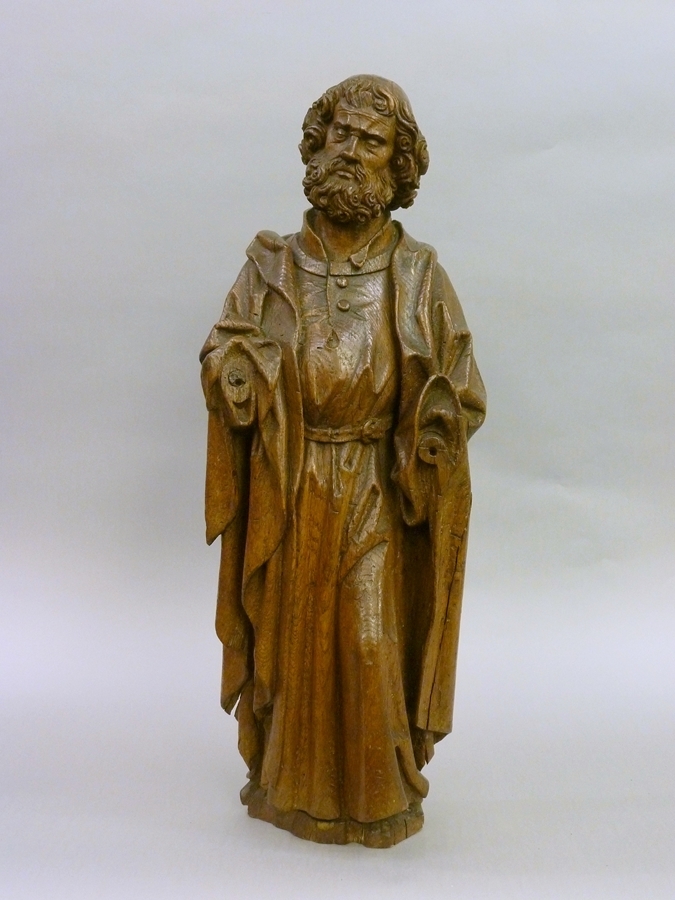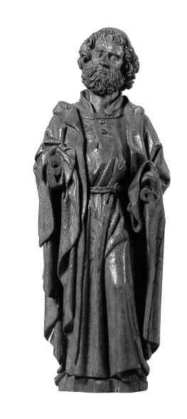 De apostel is staande voorgesteld, rustend op zijn rechterbeen. Zijn door krullend haar en dito baard omgeven gezicht heeft hij iets naar links gewend. Zijn armen houdt hij gebogen; de linker heeft hij iets hoger geheven dan de rechter. Hij staat op een kleine, vlakke grond. Zijn wijde mantel heeft hij onder beide armen opgenomen. ...
