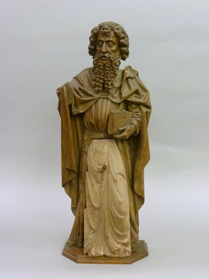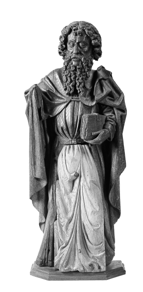 De apostel, met krullend haar en golvende, zware baard, is staande voorgesteld, rustend op zijn rechterbeen. In de linkerhand draagt hij een boek. De door zijn mantel bedekte rechterarm heeft hij opgeheven. Hij is gekleed in een gegorde tunica. Daaroverheen een mantel die met een band op de borst is gesloten. Op zijn linkerschouder vormt ...