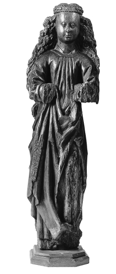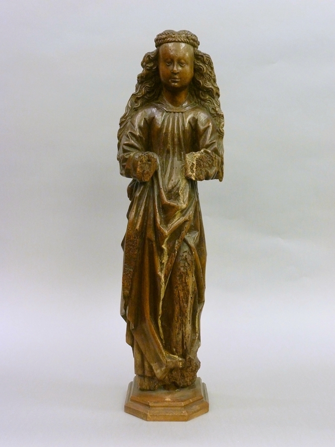 De vrouwelijke heilige is staande voorgesteld. Ze houdt beide armen gebogen voor zich en zal met de nu verdwenen handen een attribuut voor de borst hebben gehouden. Haar lange, wijduitstaande haarlokken vallen tot over haar schouders. Het beeld staat op een later, geprofileerde voetstuk met afgeschuinde hoeken. Zij draagt een wijd bovenkleed met hoekige halsuitsnijding, ...