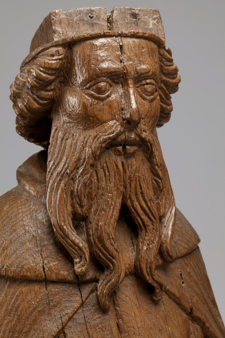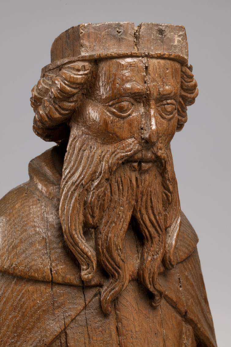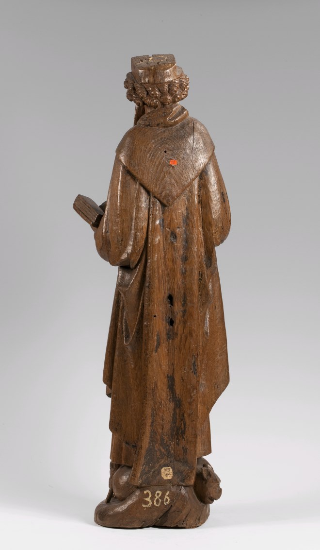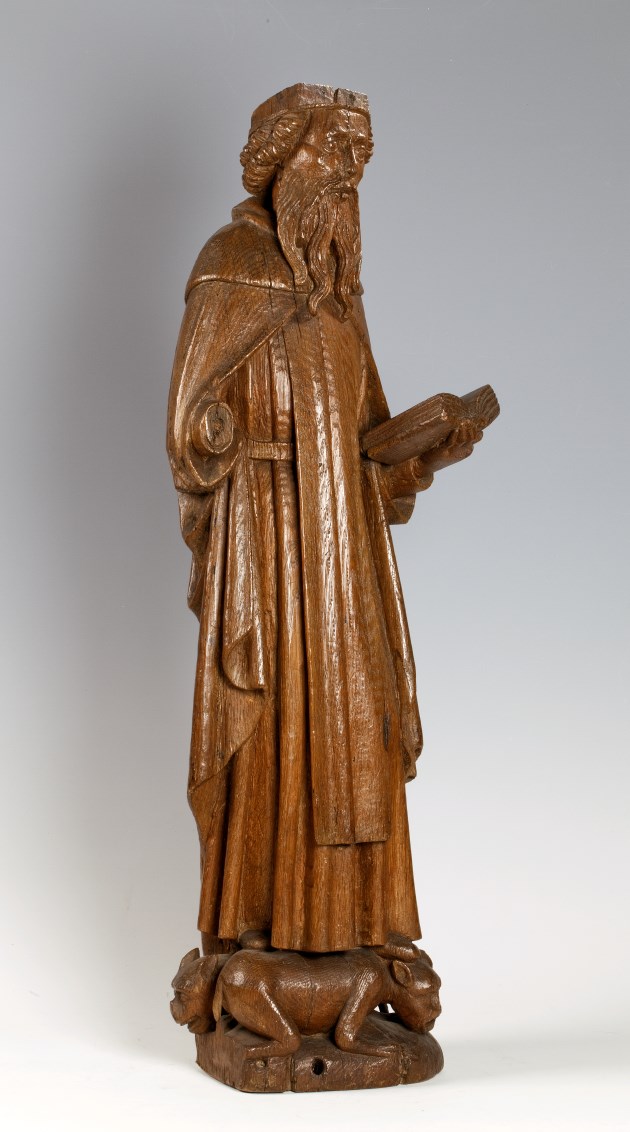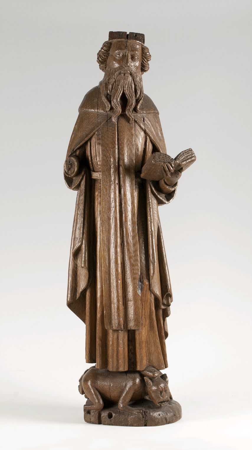 Antonius is frontaal voorgesteld. Hij staat op twee duivelfiguren. Zijn vooruitgeschoven linkervoet heeft hij op de kop van de voorste duivel gezet. Op zijn linkerhand draagt hij een opengeslagen boek. De duivels zitten achter elkaar ineengedoken op ellebogen en knieën. De voorste heeft de kop naar rechts, de achterste naar links. Ze hebben hun muilen ...