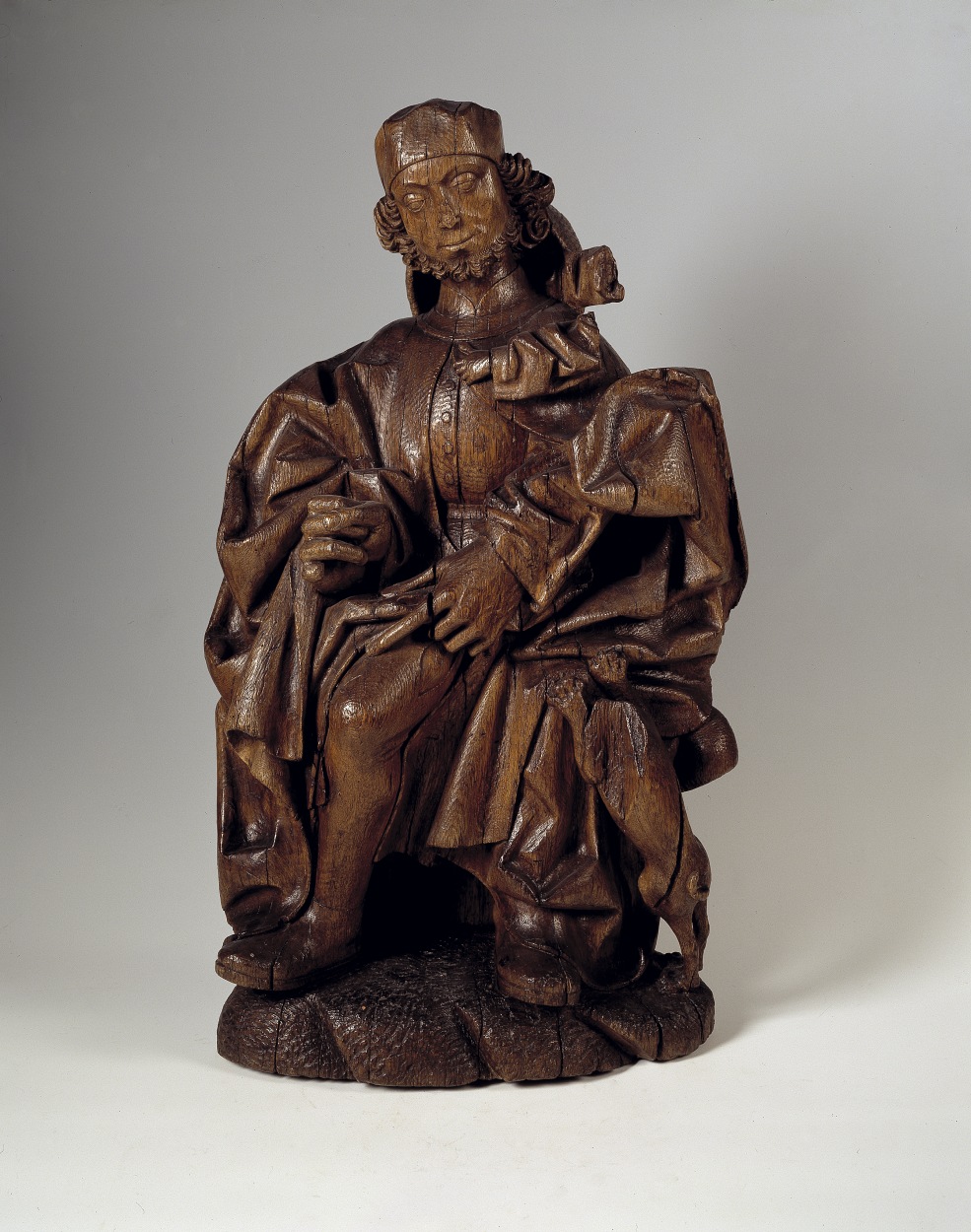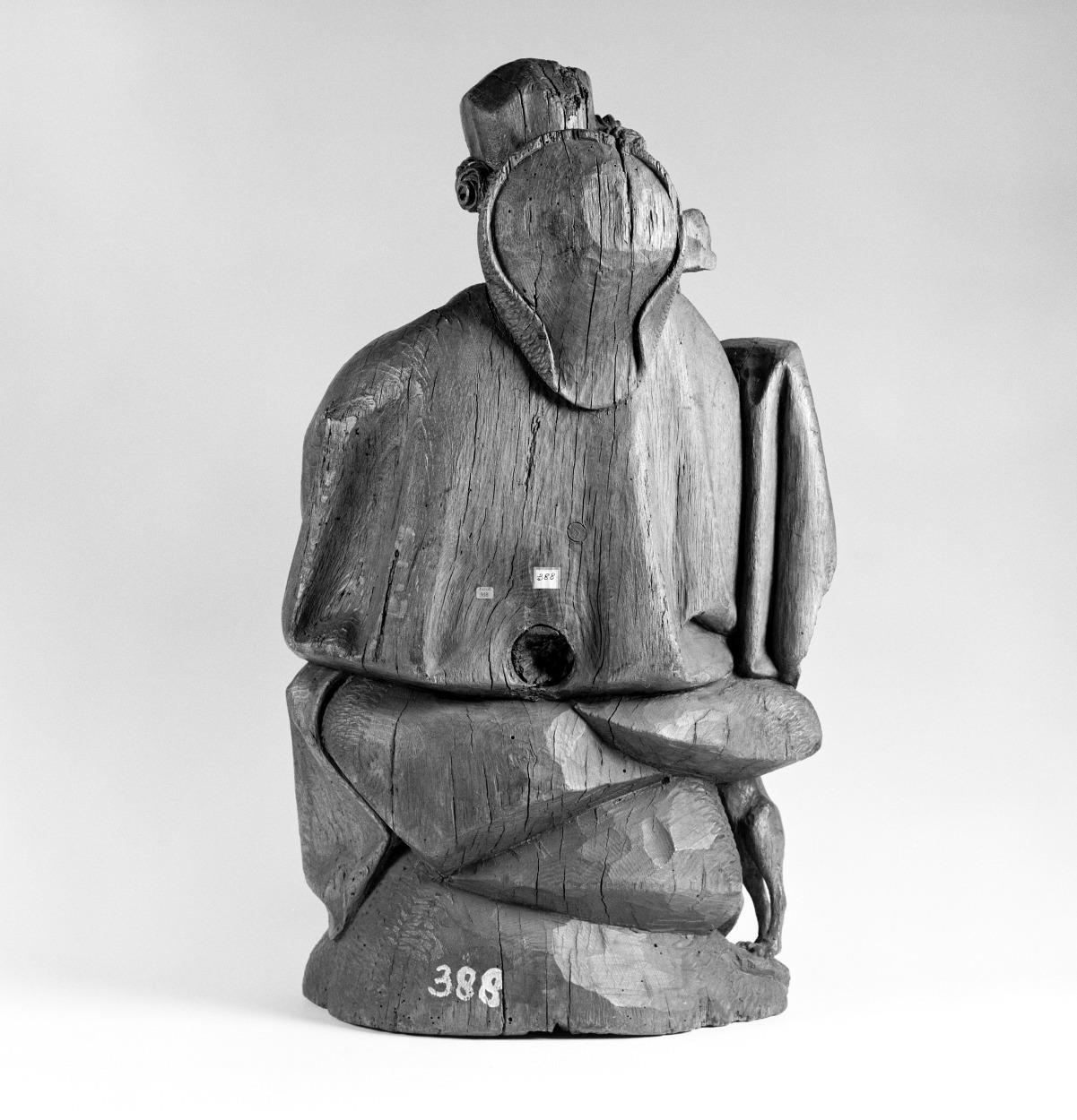 Rochus zit op een stapel stenen. Hij tilt met zijn rechterhand zijn gewaad op en wijst op de pestbuil op zijn linkerbovenbeen. In zijn linkerhand hield hij een pelgrimsstaf, die nu verdwenen is. Tegen zijn rechterzijde springt een hondje op. Bij zijn rechterschouder zijn de twee armen van een verder verdwenen engeltje zichtbaar. De engel ...