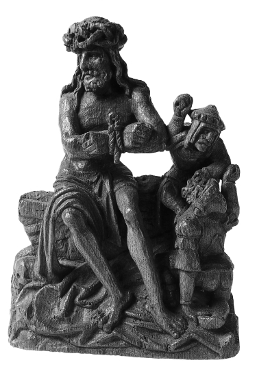 Christus zit met voor de borst gebonden handen op een rotsachtige steen. Hij heeft zijn hoofd iets naar links gedraaid. Hij is bekleed met de lendendoek en draagt een doornenkroon met ijzeren punten op het hoofd. Zijn voeten rusten op zijn kleed, waarom door de twee soldaten, die aan de rechterzijde klein zijn afgebeeld, wordt ...