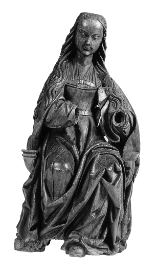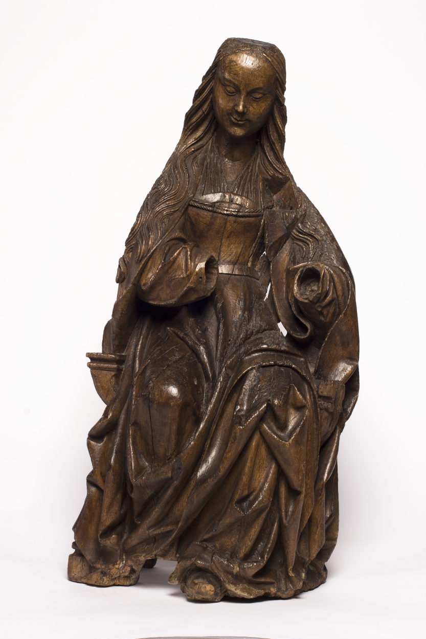 Maria zit op een vouwstoel met geprofileerde uiteinden. Op de zitting ervan ligt een kleed met ruitmotief en franjes. Maria heeft de handen opgeheven om het nu verdwenen Christuskind, dat op haar linkerhand zat of op haar linkerbeen stond, vast te houden. Zij draagt een omgord bovenkleed met rechthoekige halsuitsnijding met gebogen onderrand. In de ...
