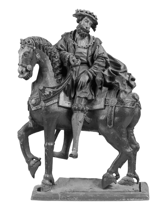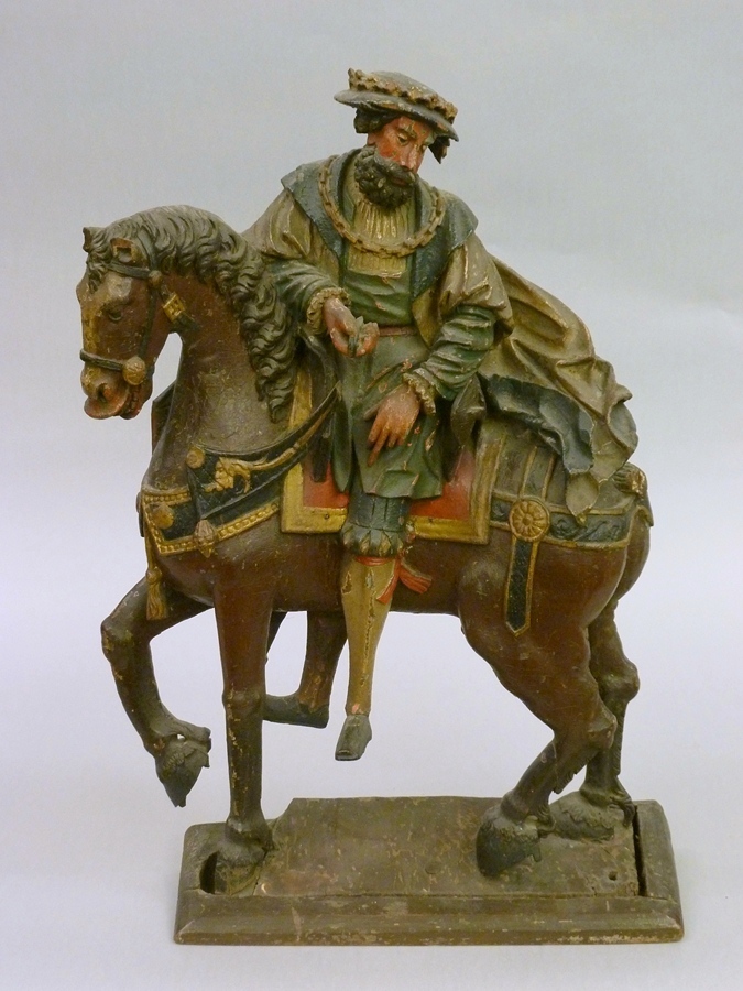 Terwijl het paard naar links voortstapt, heeft de ruiter zich in het zadel omgewend. Zijn bovenlichaam is frontaal naar de beschouwer gekeerd, zijn gelaat, met lange krullende baard en dito haar, driekwart naar rechts. Hij kijkt naar beneden en houdt met zijn rechterhand de teugels vast. Zijn linkerhand hangt naar beneden. Het paard staat op ...