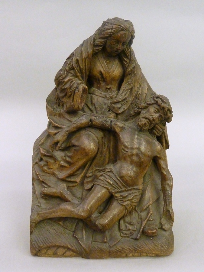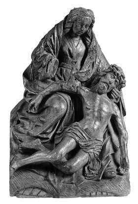 Maria, op een rots gezeten, ondersteunt met haar linkerhand het naar rechts gezakte hoofd van Christus. Zijn lichaam is frontaal weergegeven. Het bovenlichaam wordt gesteund door haar linkerknie, terwijl onderlichaam en benen in een bocht voor haar rechterknie op de grond rusten. Zijn rechterarm hangt over haar rechterbeen, zijn linkerarm hangt naar beneden. De rotspartij ...