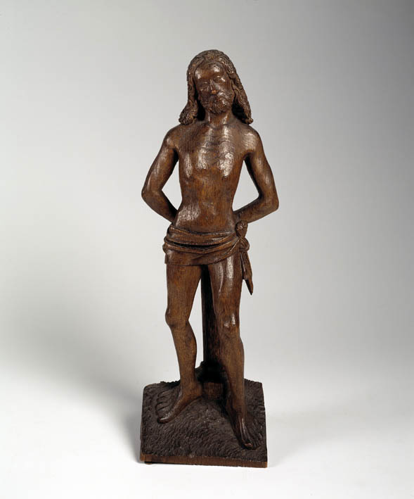 Christus staat met de handen achter zijn rug aan de geselpaal gebonden. Zijn linkervoet is iets naar voren geschoven. Hij neigt het hoofd iets naar links. Hij staat op een met grove kuiltjes en (latere) zigzaggroeven aangeduide, rechthoekige, schuinoplopende grond. Hij is bedekt met de lendendoek, die op zijn linkerheup is geknoopt. Zijn lange, krullende ...