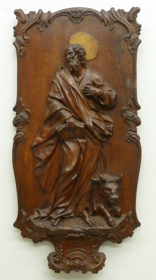Lucas is frontaal terwijl hij naar links kijkt, afgebeeld op een paneel, dat aan de hoeken en aan de onderzijde met rococo-ornament is versierd. Hij houdt met de rechterhand een opengeslagen boek vast en legt de linker op zijn hart. Lucas is gehuld in een wijde mantel over een gegorde lange tunica. De os, zijn ...