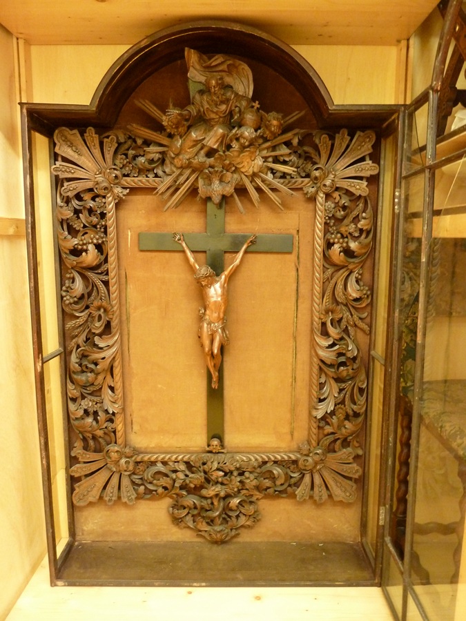 Christus hangt uitgestrekt aan het kruis. Zijn voeten zijn over elkaar gespijkerd, rechts over links, Zijn hoofd met de gesloten ogen neigt naar links. Op het hoofd de doornenkroon. In zijn rechterzijde een bloedende wonde. De lendendoek is over een koord om zijn heupen gedrapeerd. Op het kruis is aan de onderzijde een schedel met ...