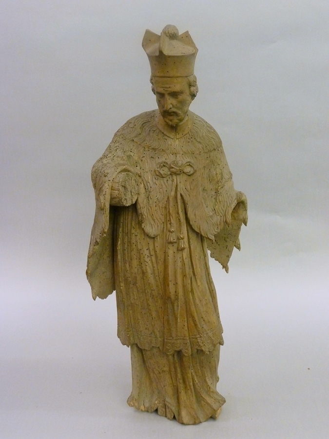 De heilige is staande voorgesteld, rustende op zijn rechterbeen. Hij is gekleed in toga, superplie en een op de borst met een strik gesloten almucium. Op het hoofd draagt hij een bonnet.