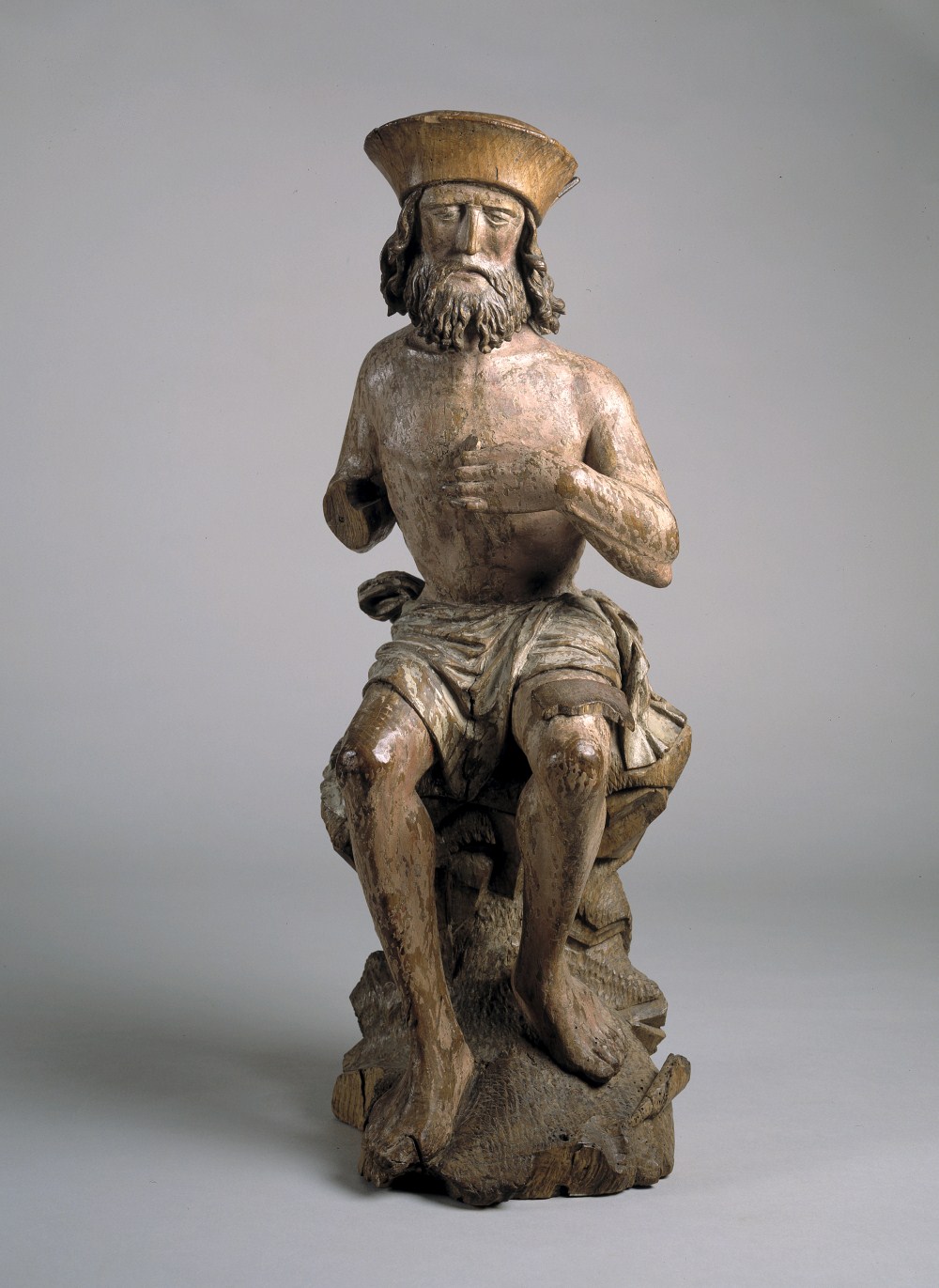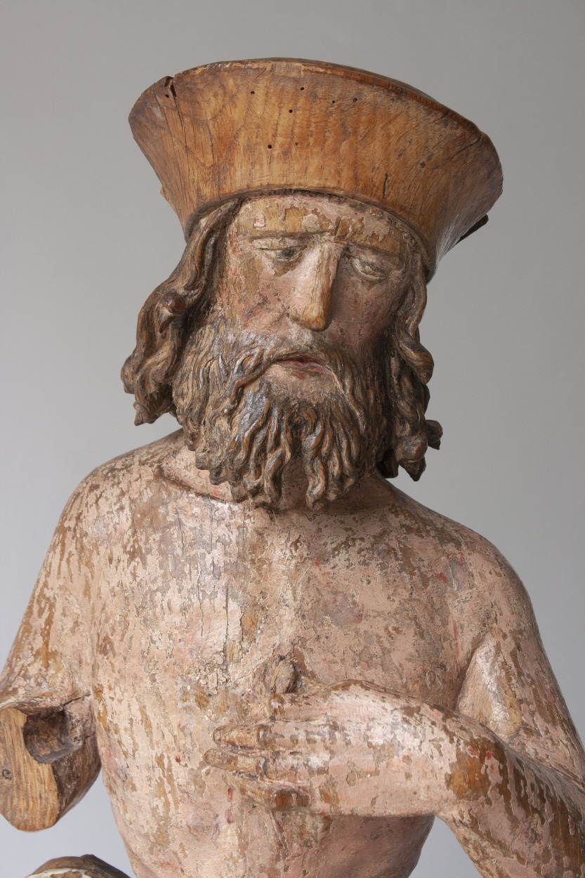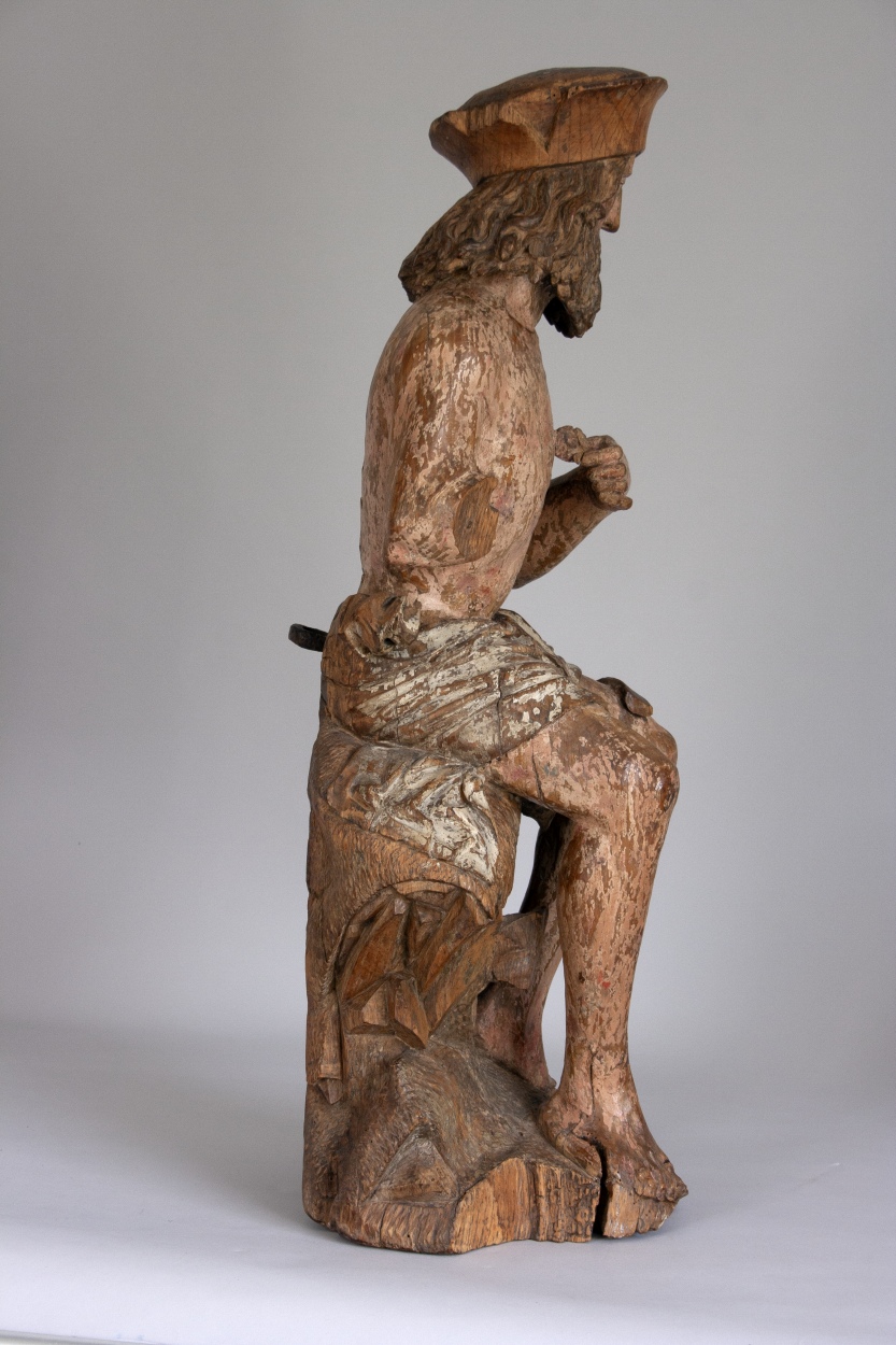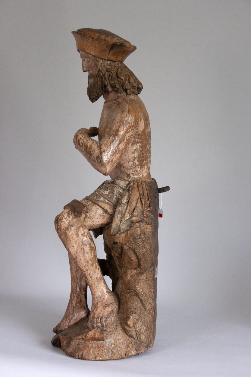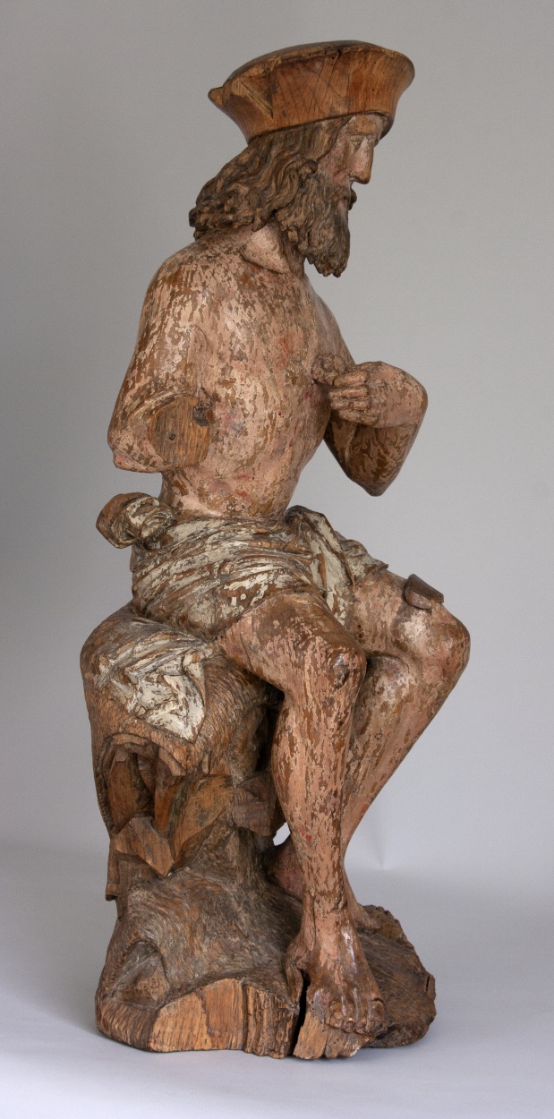 Job zit op een mesthoop en heeft zijn rechtervoet iets vooruitgeschoven. Hij krabt zich met een scherf die hij in zijn linkerhand houdt op de borst. Op zijn linkerknie ligt een grotere scherf. Zijn gelaat, dat een droevige uitdrukking heeft, is iets naar rechts gewend. Haar en baard van de heilige bestaan uit lange, aan ...