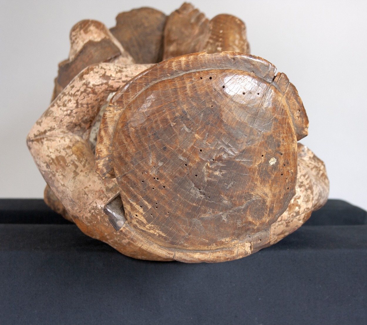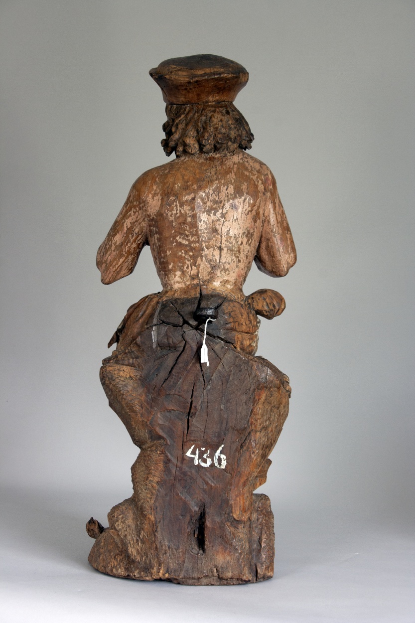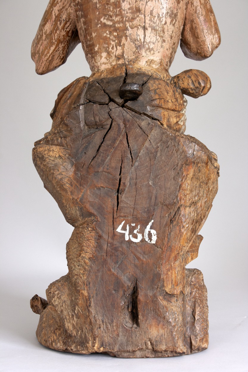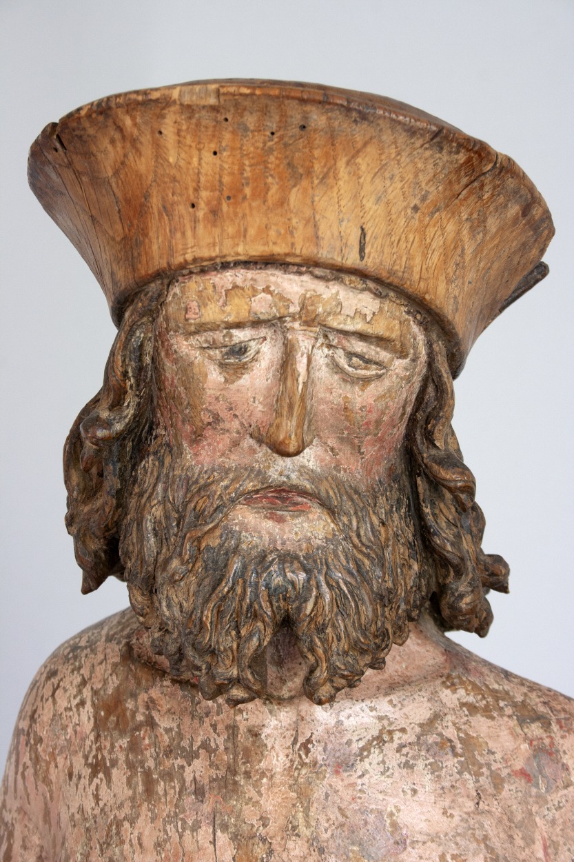 Job zit op een mesthoop en heeft zijn rechtervoet iets vooruitgeschoven. Hij krabt zich met een scherf die hij in zijn linkerhand houdt op de borst. Op zijn linkerknie ligt een grotere scherf. Zijn gelaat, dat een droevige uitdrukking heeft, is iets naar rechts gewend. Haar en baard van de heilige bestaan uit lange, aan ...