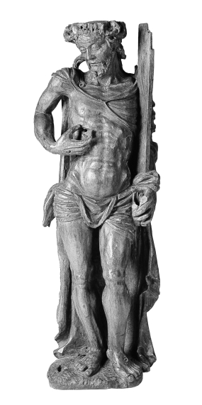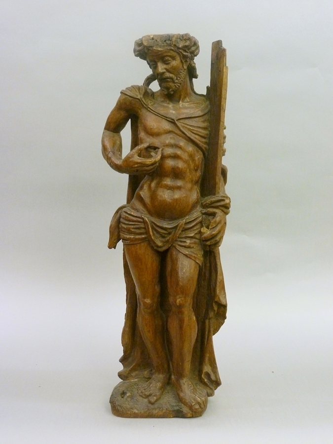 Christus is staande voorgesteld, rustend op zijn rechterbeen. Zijn gezicht is driekwart naar links gedraaid. Met zijn linkerarm drukt hij het kruis tegen zich aan met zijn rechterhand toont hij de wond in zijn borst. In zijn linkerhand droeg hij mogelijk een nu verdwenen lans. Hij staat op een een met zigzaggroeven aangeduid, afgerond grondje. ...