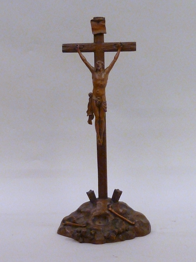 Christus zonder doornenkroon hangt met naar boven uitgestrekte armen aan het kruis, dat in een rotsbodem staat. De rechter voet is over de linker heen gespijkerd. Midden onder het kruis bevindt zich in de grond een holte, waarin zich een schedel bevond en twee beenderen. Het lichaam van Christus is bekleed met een lendendoek, die ...
