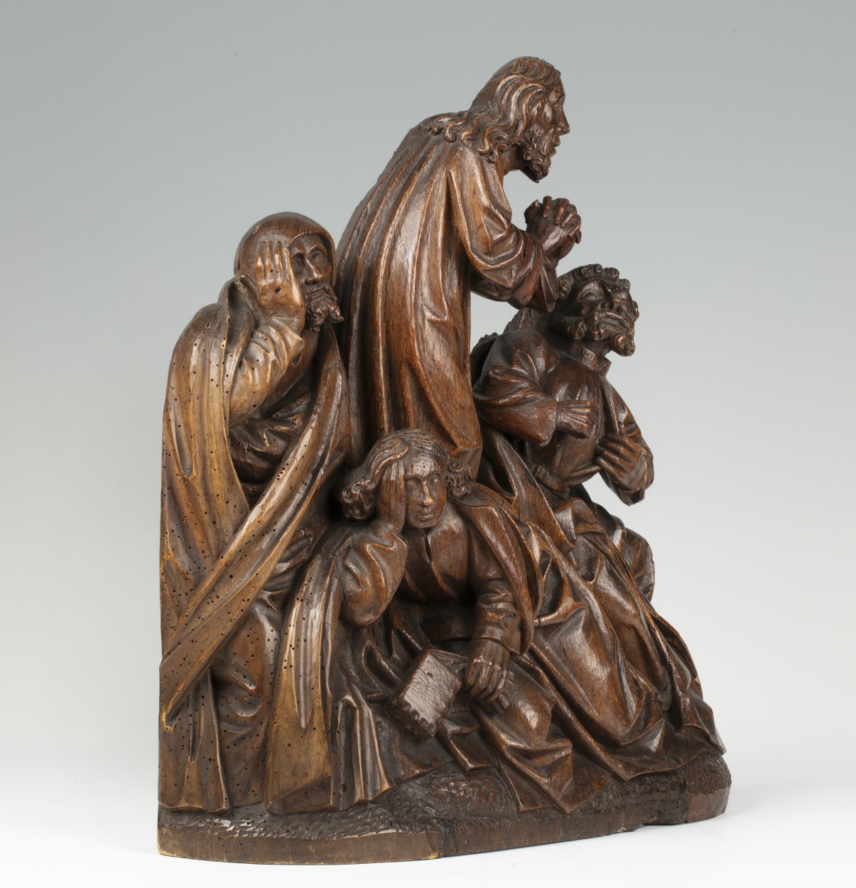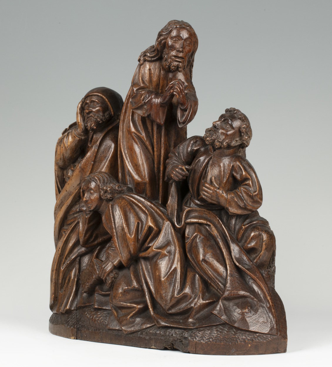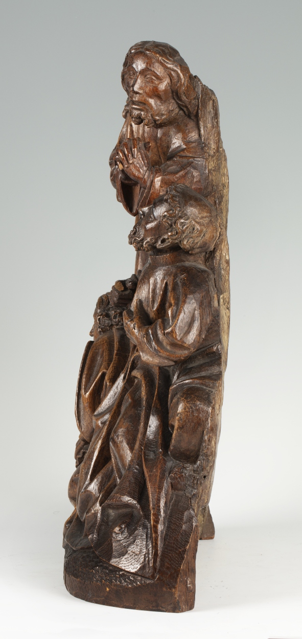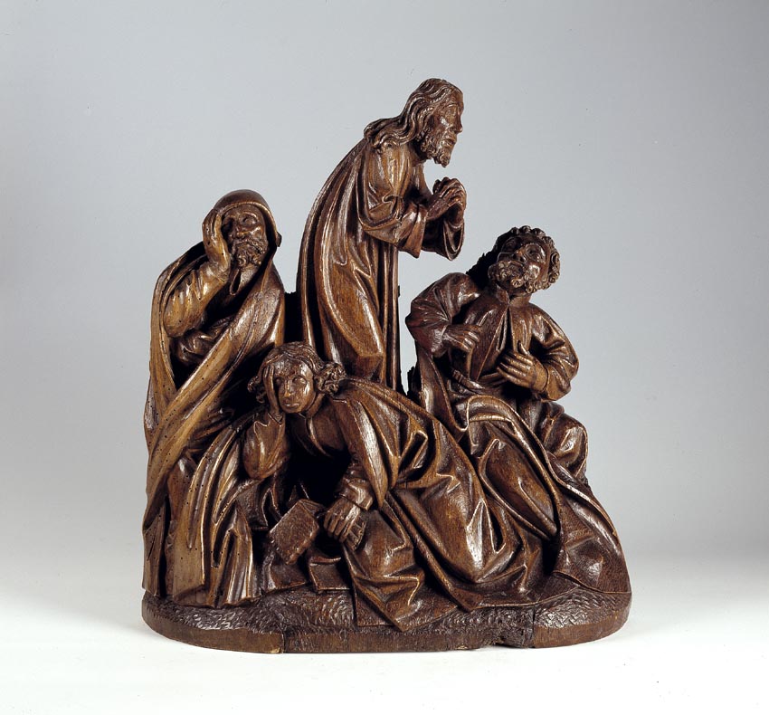 In het midden van de voorstelling staat Christus, biddend, driekwart naar rechts gewend. Hij is iets door zijn knieën gezakt en houdt zijn handen gevouwen voor zich. Hij heeft zijn mond geopend en zijn gezicht is smartelijk vertrokken. Rondom hem drie discipelen. Links de slapende Jacobus, frontaal, het hoofd in zijn rechterhand gesteund. In het ...