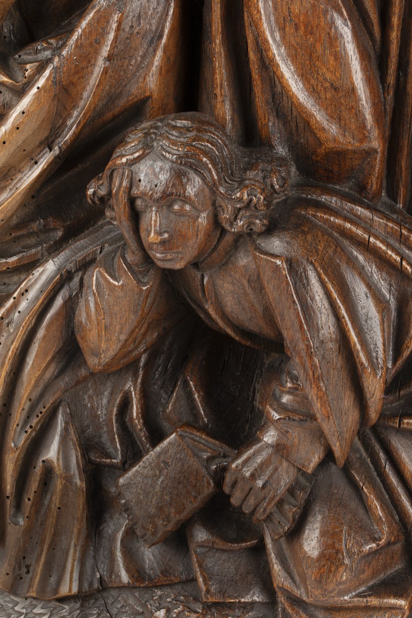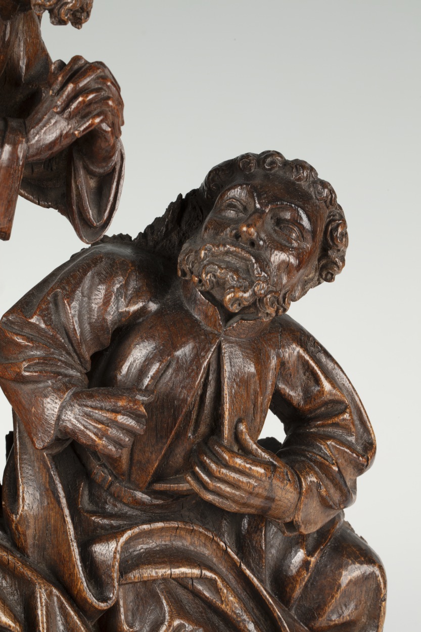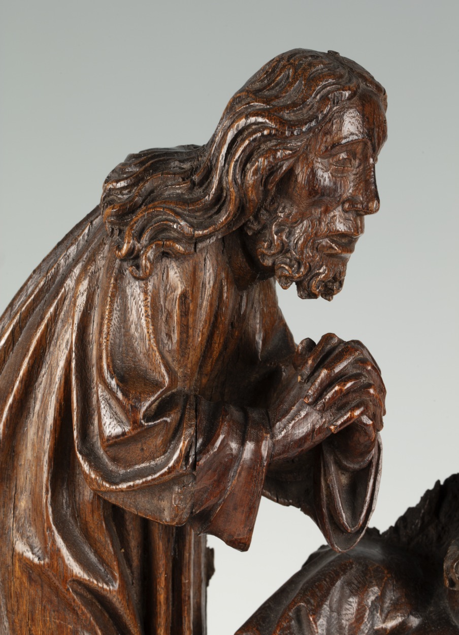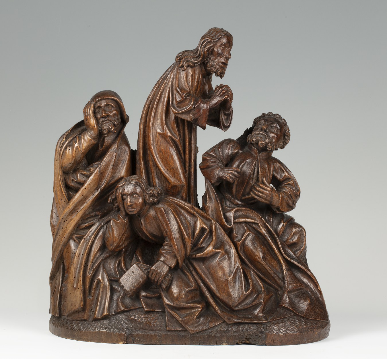 In het midden van de voorstelling staat Christus, biddend, driekwart naar rechts gewend. Hij is iets door zijn knieën gezakt en houdt zijn handen gevouwen voor zich. Hij heeft zijn mond geopend en zijn gezicht is smartelijk vertrokken. Rondom hem drie discipelen. Links de slapende Jacobus, frontaal, het hoofd in zijn rechterhand gesteund. In het ...