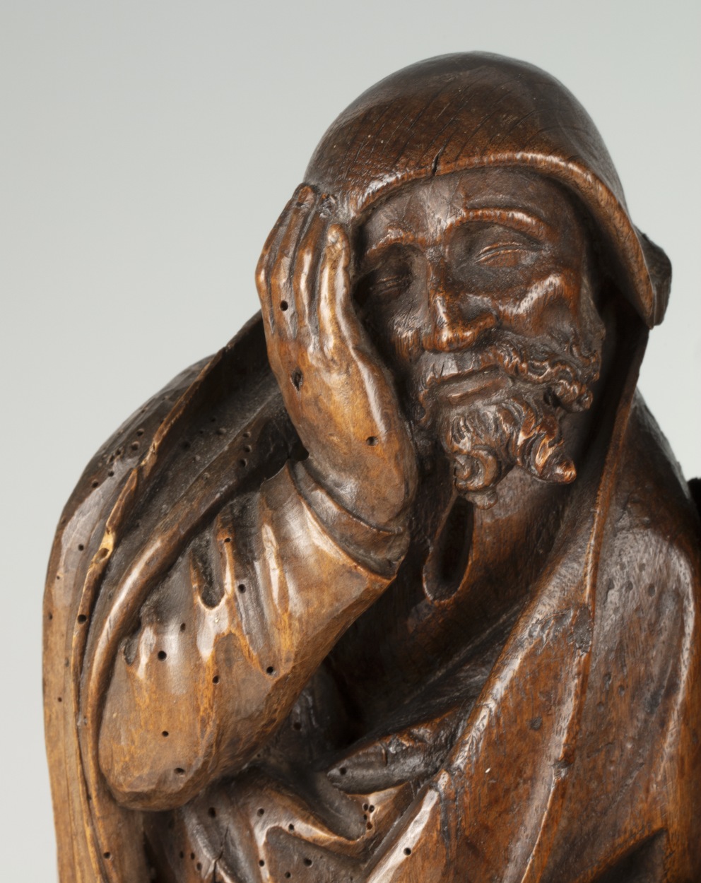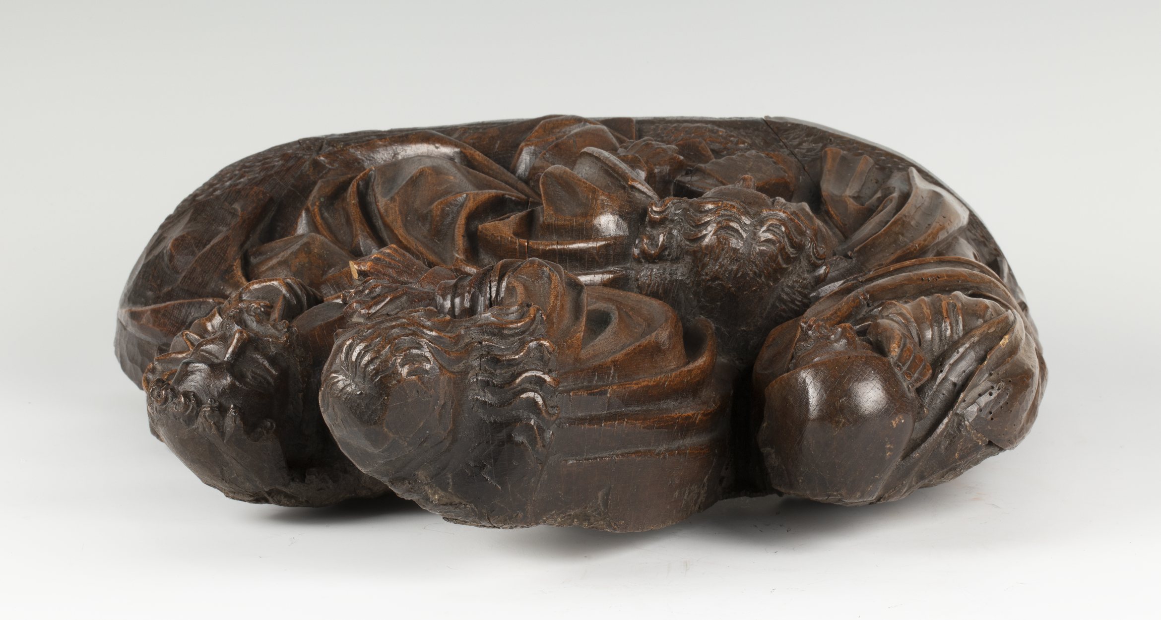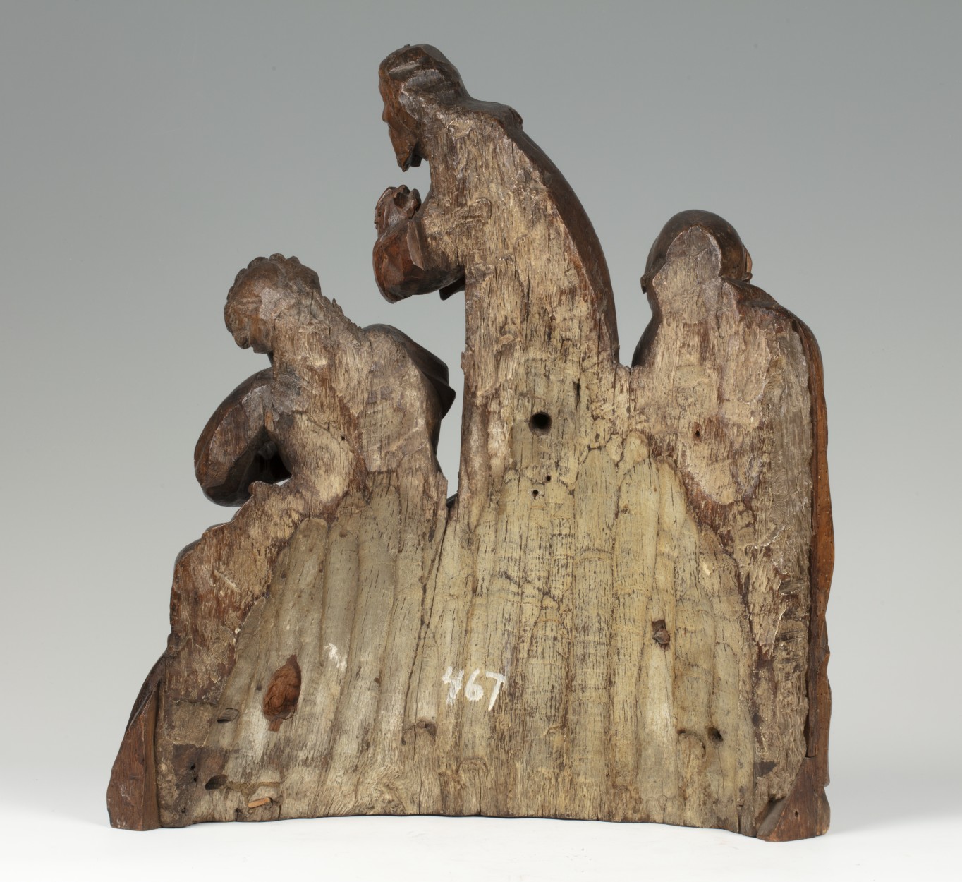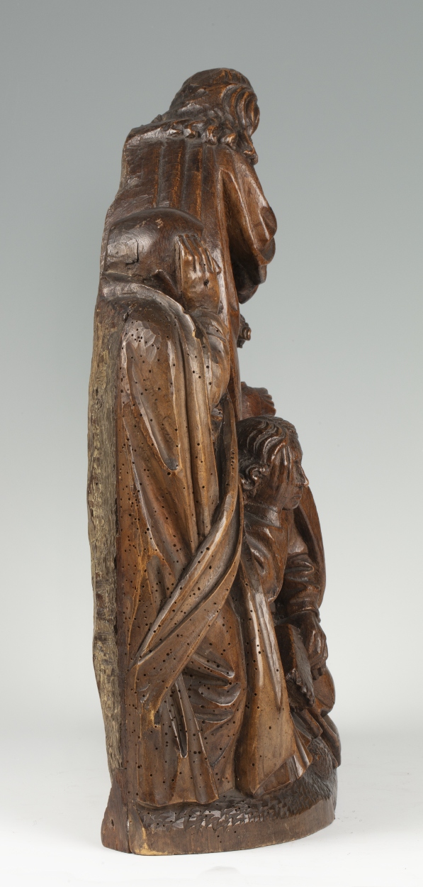 In het midden van de voorstelling staat Christus, biddend, driekwart naar rechts gewend. Hij is iets door zijn knieën gezakt en houdt zijn handen gevouwen voor zich. Hij heeft zijn mond geopend en zijn gezicht is smartelijk vertrokken. Rondom hem drie discipelen. Links de slapende Jacobus, frontaal, het hoofd in zijn rechterhand gesteund. In het ...