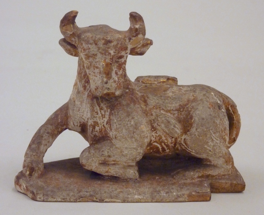 De leeuw is en profil liggend naar rechts voorgesteld. Hij heeft zijn poten onder het lichaam en zijn kop naar de beschouwer gewend. Zijn linkervoorpoot steekt naar voren. De staart is tussen de achterpoten door onder de buik geslagen. Het dier ligt op een glad grondje. Polychromie: Sporen van polychromie: witte grondering waarop een rode ...