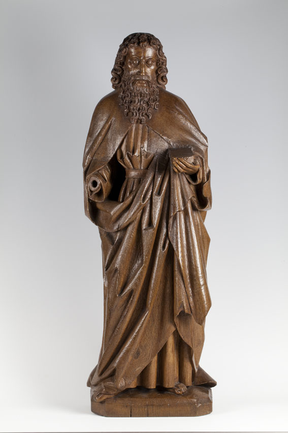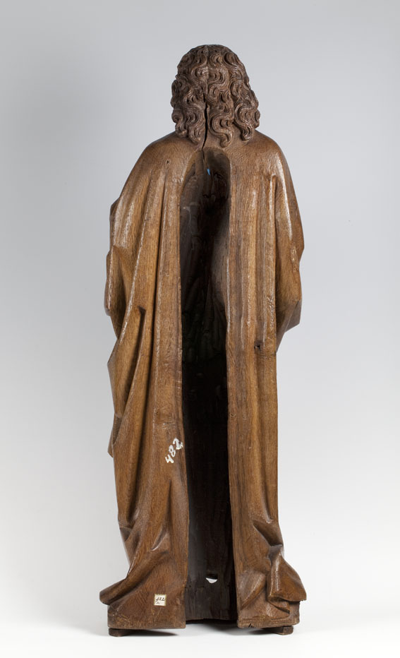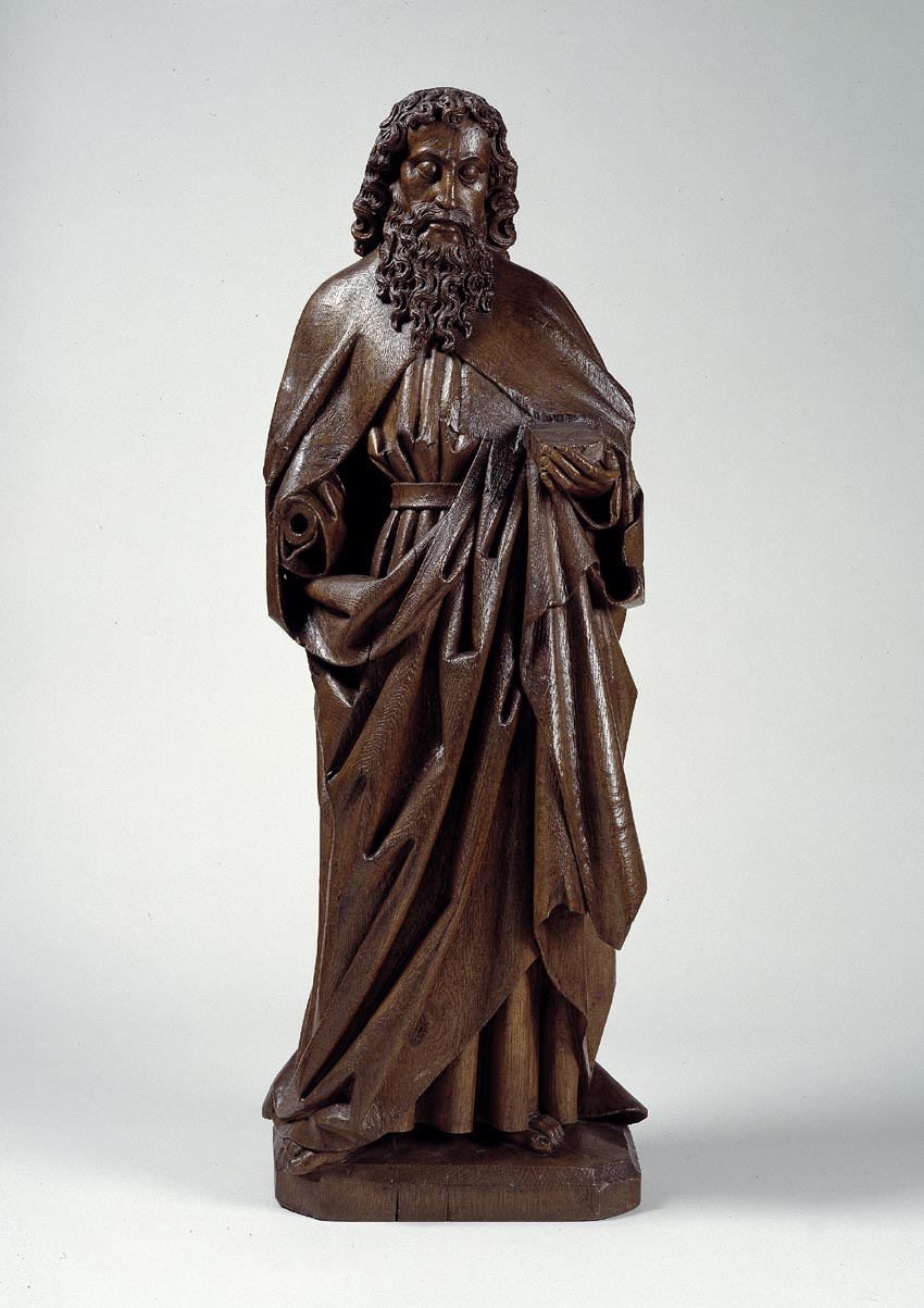 De apostel is staande voorgesteld, rustend op zijn linkerbeen. De rechtervoet is iets zijwaarts geplaatst. Hij kijkt naar beneden. Op zijn linkerhand droeg hij een nu grotendeels weggesneden boek. De heilige staat op een gladde, rechthoekige grond met afgeschuinde hoeken, die langs de bovenzijde is voorzien van een kwartholprofiel. Hij is gekleed in een bovenkleed ...