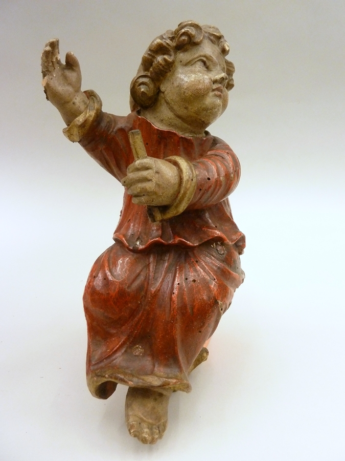 Christus is zittend, bijna en profil naar links afgebeeld. Het heeft zijn hoofdje omgedraaid en kijkt naar rechts omhoog. Zijn rechterhandje is opgeheven, terwijl hij in zijn linker een fragment van een ondefinieerbaar voorwerp vasthoudt. Het kind is gekleed in een gegord en aan de onderzijde uitwaaiend tuniekje. Polychromie: Omvangrijke resten van polychromie. Tuniekje rood, ...