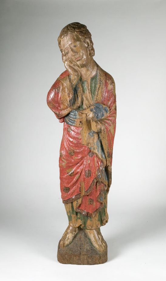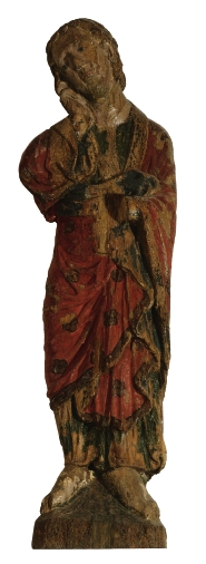 Johannes de Evangelist is staande afgebeeld. Hij staat blootsvoets op een schuin oplopende grond, terwijl hij met zijn rechterhand het naar links neigende hoofd ondersteunt. Zijn mantel is over zijn schouders geslagen, voor het lichaam langs gedrapeerd en het uiteinde is opgenomen onder de linkerarm. De mantel is zodanig om de rechterarm geslagen dat hij ...