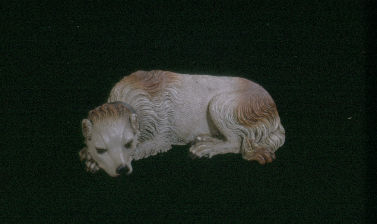 Napolitaanse kerststal: langharige bruin-witte hond, liggend