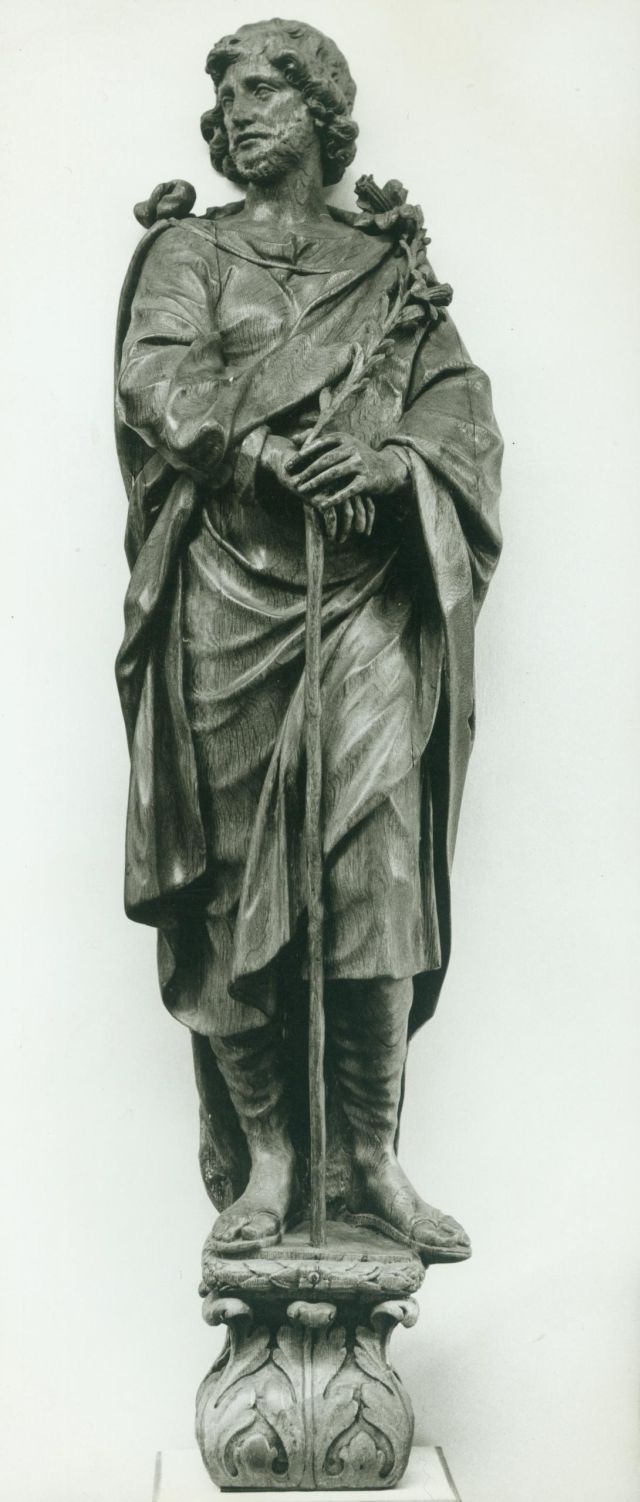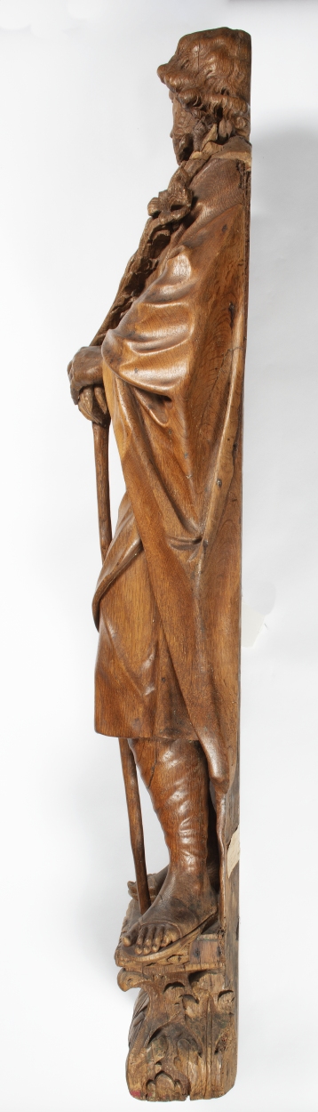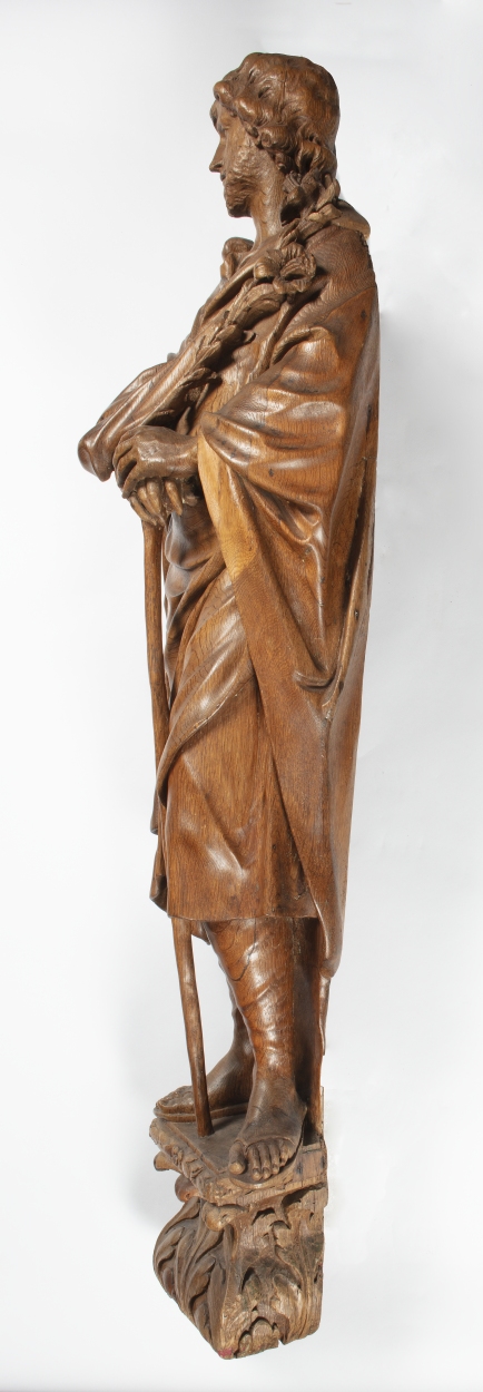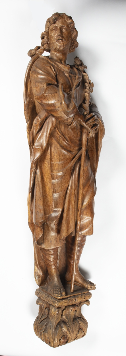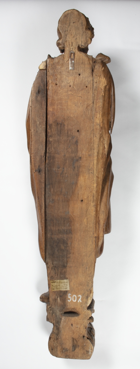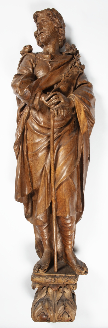 Jozef, met kort haar en korte ronde baard, staat op een met acanthusbladeren versierd voetstuk. De beide handen houdt hij gevouwen over zijn stok, die hij voor zich houdt. Hij wendt het hoofd naar links. Over een korte knie-lange tunica en broek draagt hij een korte mantel. Aan zijn voeten sandalen. In zijn linkerhand draagt ...