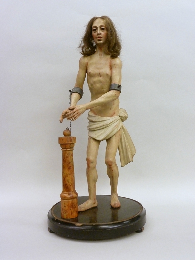 Christus staat iets door zijn knieën gebogen, gekleed in een lendendoek, geketend aan de geselkolom. Zijn haar is echt mensenhaar. Over zijn hele lichaam zijn bloedsporen te zien. Om zijn armen zijn ijzeren banden bevestigd, die met kettinkjes aan de bovenzijde van de geselkolom - een bol met ijzeren ijzeren oogje - waren vastgemaakt. Hij ...