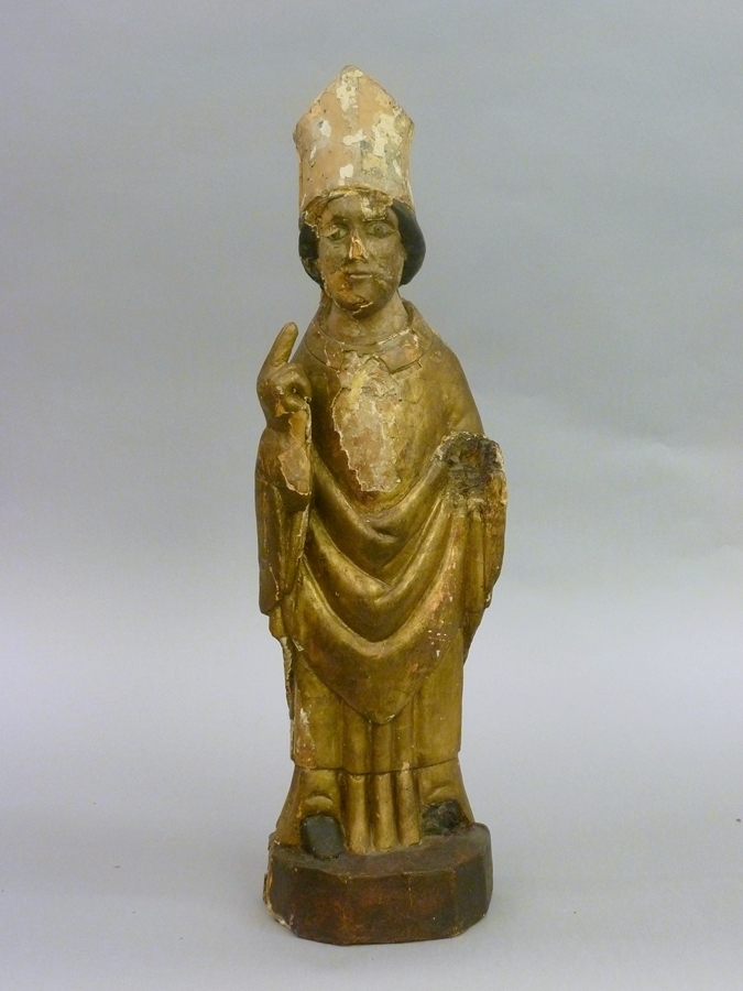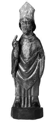 De bisschop is staande voorgesteld en gekleed in pontificaal gewaad; de mijter op het hoofd. Hij heft zijn rechterhand ten zegen op. Hij staat op een hoge, negenhoekige sokkel. Polychromie: Een nieuwe polychromie is aangebracht op een zeer dikke krijtgrondlaag. Een oudere, mogelijk originele polychromie, op een dunne grondlaag, is in lacunes zichtbaar. De nieuwe ...