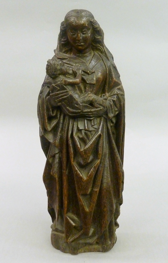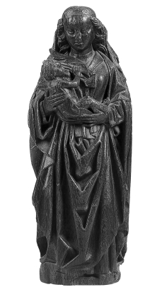 Maria is staande voorgesteld, rustend op haar rechterbeen. Zij draagt het naakte Christuskind in een doek in beide handen. Het kind, en profil afgebeeld, heeft met zijn rechterhandje een slip van de sluier van Maria opzijgeschoven en drinkt aan haar borst. Maria is gekleed in een om de taille nauwsluitend kleed met V-vormige halsuitsnijding en ...