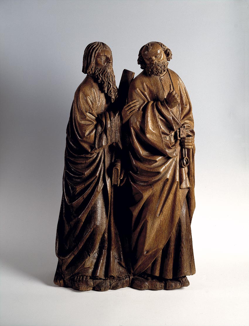 De twee apostelen zijn lopend naar rechts voorgesteld. Voorop gaat Petrus, die omkijkt naar Andreas. Zijn lichaam is driekwart naar rechts gedraaid. Zijn vierkante gelaat is en face weergegeven en wordt omkranst door een korte baard en kort krullend haar. In zijn linkerhand draagt hij zijn attribuut, de sleutels, zijn rechter heeft hij opgeheven. Andreas ...