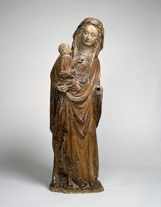 Maria is staande voorgesteld. Zij rust op haar rechterbeen en staat met de rechtervoet op een slip van haar kleed. Zij neigt het bovenlichaam iets naar rechts. Ze heeft het hoofd gewend naar het Christuskind, dat ze op haar rechterarm draagt. In zijn rechterhand houdt hij een appel, terwijl zijn linkerhand op de borst van ...