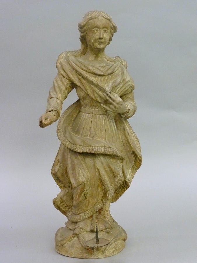 Maria is staande voorgesteld, rustend op haar linkerbeen, terwijl zij met haar rechtervoet de slang vertrapt. In het basement is een ijzeren kaarsenhoudertje ingebracht. Zij draagt een lang, fijngeplooid gegord gewaad, waar overheen een over haar schouders vallende sluier en een mantel, die opzij uitplooit en over haar knieën geslagen is. De mantel heeft een ...