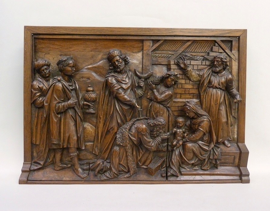 Voor een bouwvallige stal, opgetrokken uit steen en hout, zit Maria op een verhoging met het naakte Christuskind op haar schoot. Maria is gekleed in een lange tunica en een lange mantel, die over het hoofd is geslagen. Achter haar staat Jozef, die zijn rechterhand uitsteekt naar de drie koningen en hun gevolg. Hij draagt ...