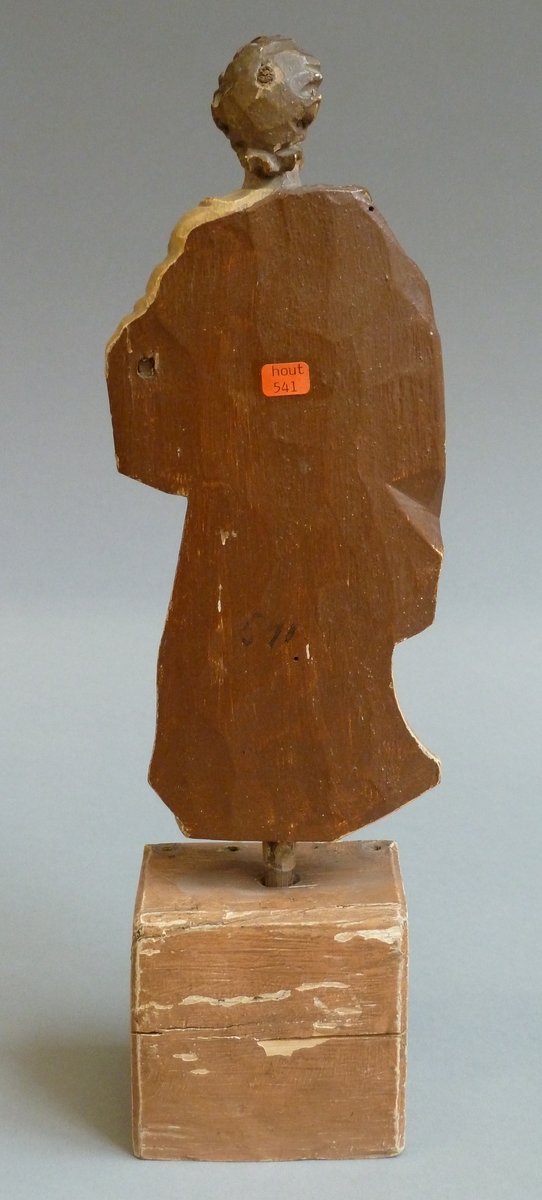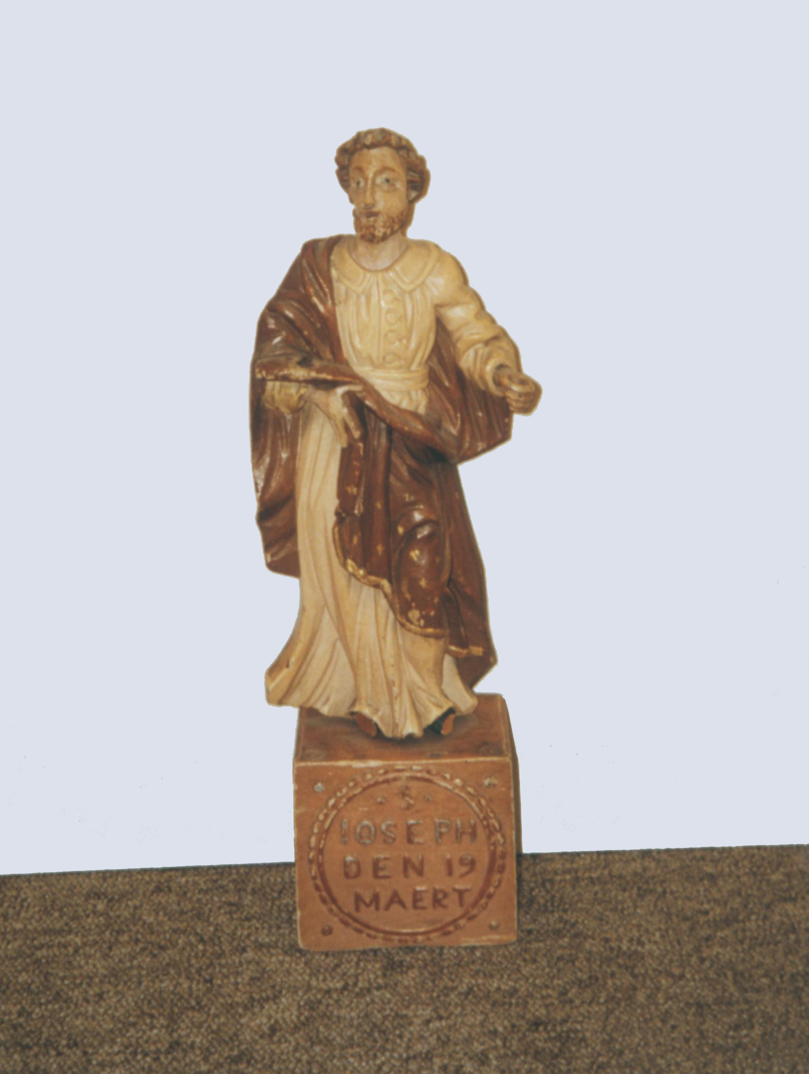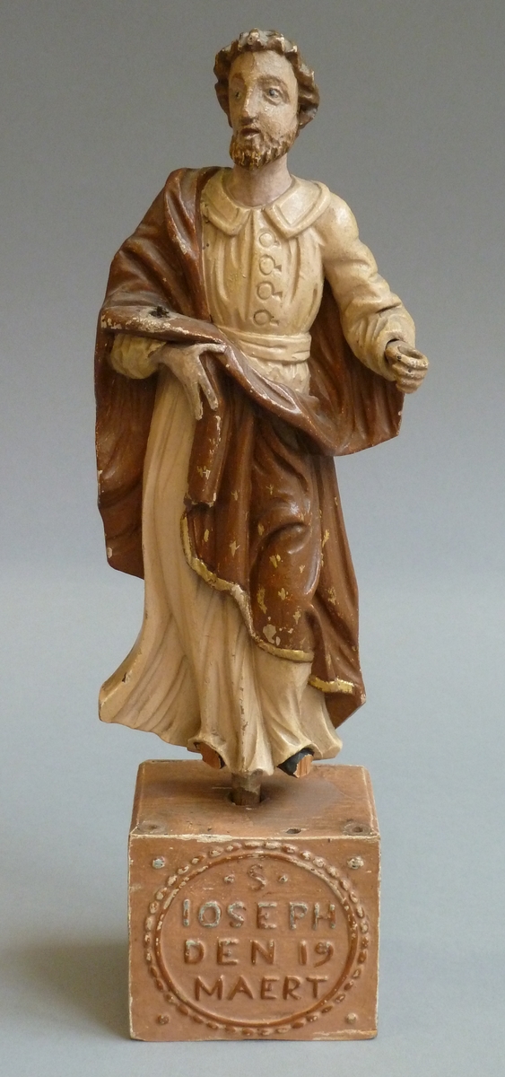 Jozef is staande voorgesteld, rustend op zijn rechterbeen. hij houdt zijn linkerhand vooruitgestoken, terwijl hij met de andere hand zijn mantel bijeen houdt.Hij draagt een lang, beige, gegord gewaad met platte kraag. Over zijn rechterschouder valt de bruine mantel los naar beneden. Hij staat op een rechthoekig voetstuk met opschrift in medaillon:"Ioseph den 19 Maert". ...