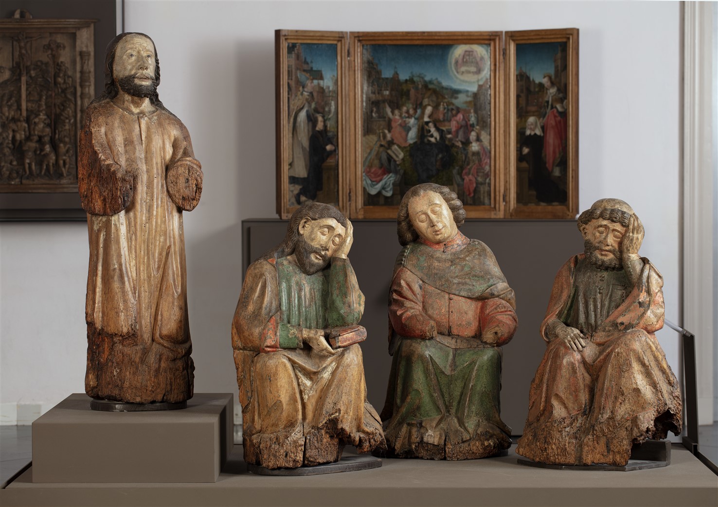 Christus is iets naar links gewend, knielend op een rotspartij voorgesteld. Hij houdt het gebaarde gezicht opgeheven. Hij heeft zijn mond geopend en kijkt smartelijk naar boven. Zijn armen zijn half geheven. Zijn haar, dat aan de bovenkant glad is en golvend bij de slapen, hangt in fijne strengen over zijn schouders. Christus is gehuld ...