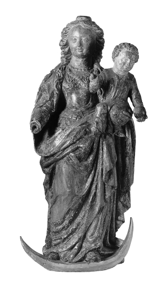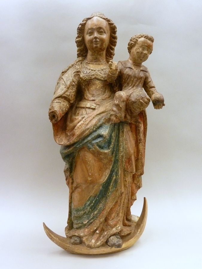 Maria staat met vooruitgeschoven linkerbeen op de maansikkel. Op haar linkerarm draagt zij het Christuskind. Het kind is frontaal naar de beschouwer gewend. Het heeft de rechterhand zegenend opgeheven en in de linkerhand draagt het de wereldbol. Maria is gekleed in een bovenkleed, dat bij de hals accoladevormig is uitgesneden, zodat het hemd zichtbaar is. ...