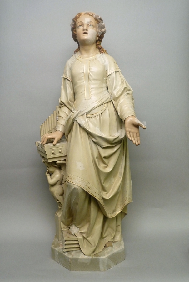 Cecilia is staande voorgesteld rustend op haar linkerbeen. Aan haar rechterzijde staat een orgeltje, dat zij met haar rechterhand bespeelt. Zij kijkt omhoog en heeft haar mond geopend alsof zij zingt. Zij is gekleed in een lang ondergewaad met lange mouwen, waarover een keurs met versierde boorden. De achterkant van het hoofd is bedekt met ...