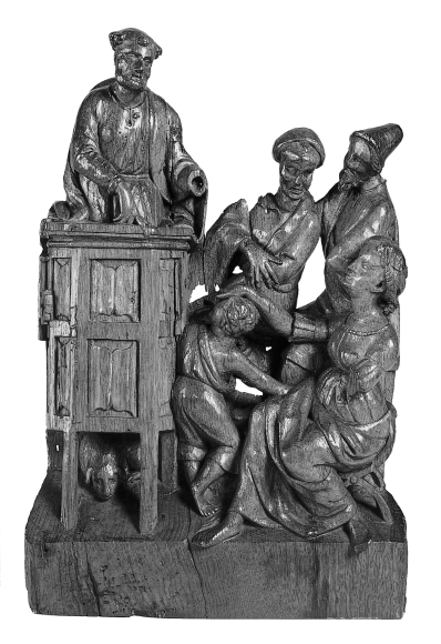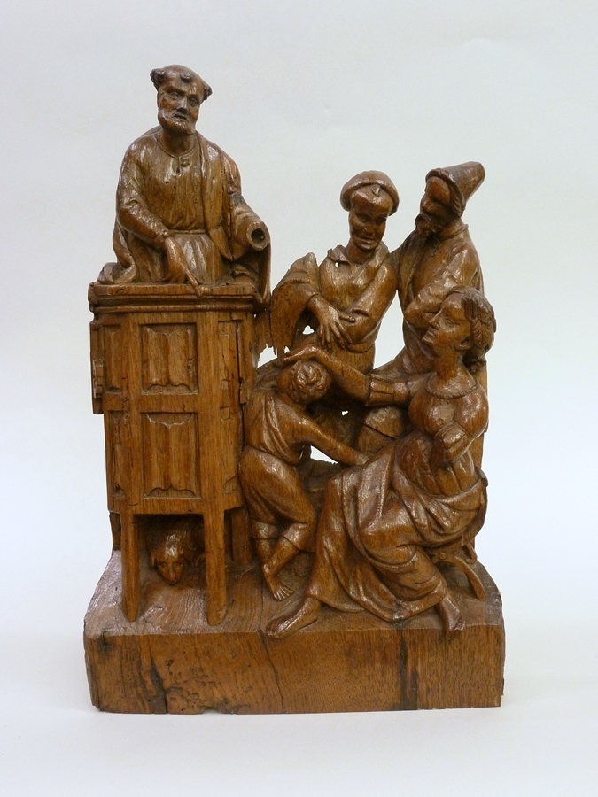 Links staat Petrus, driekwart naar rechts gewend, op de preekstoel. Hij steunt met zijn rechterhand op de rand. Rechts van de preekstoel is een groepje van vier toehoorders afgebeeld. Op de achtergrond staan twee mannen, waarvan de voorste zich omwendt naar de achterste. Hij laat zijn rechterhand rusten op zijn linkeronderarm. De achterste houdt zijn ...
