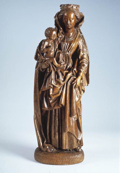 Maria is staande voorgesteld, rustend op haar rechterbeen. Het deels naakte Christuskind zit op haar rechterarm. Met haar linkerhand houdt Maria een slip van haar mantel op. Het kind houdt in zijn rechterhand een appel aan een takje met een blaadje en met de linker grijpt hij naar de sluier van zijn moeder. Maria staat ...