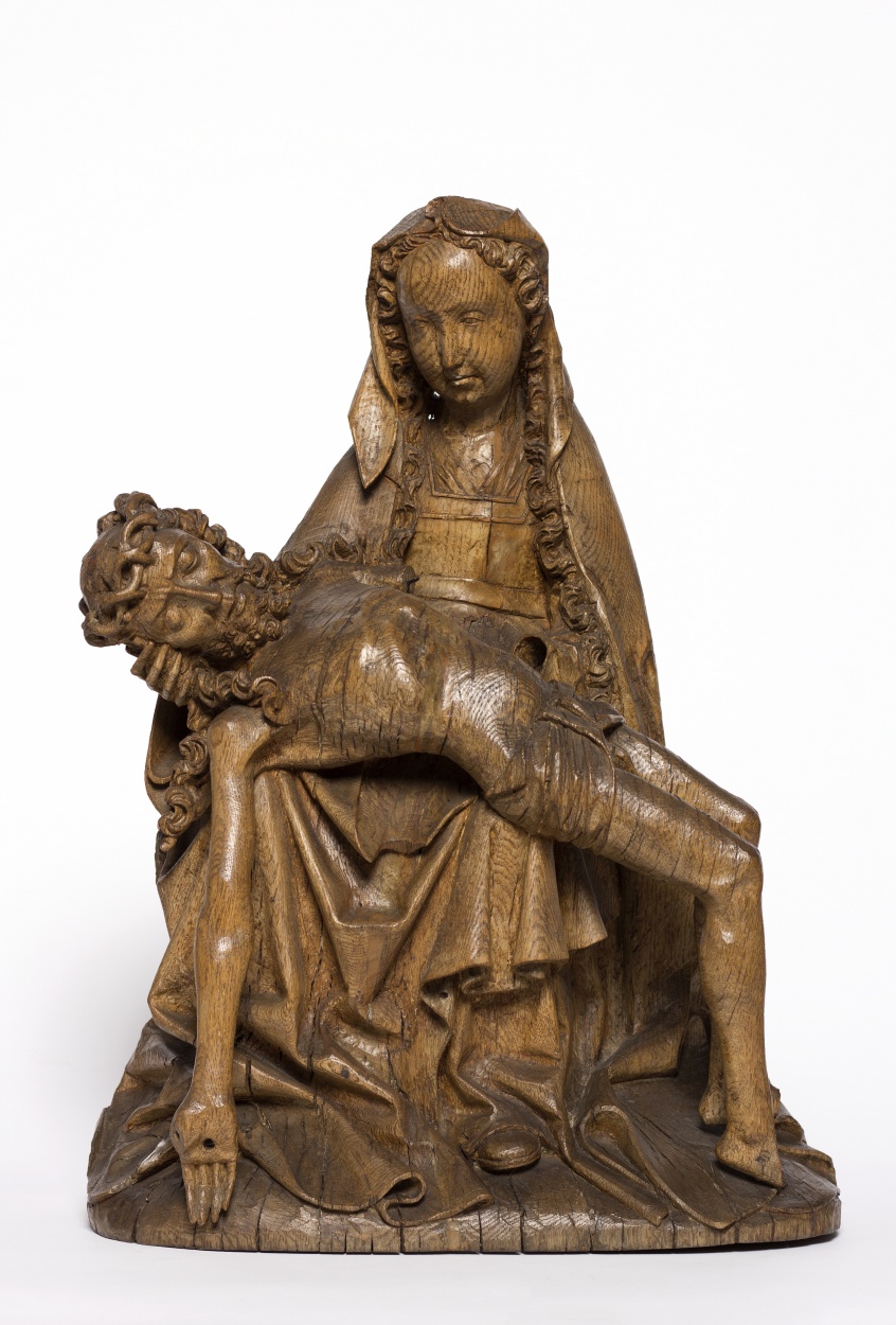 Maria zit op een heuveltje en houdt het lichaam van de gestorven Christus naar links op haar schoot. Christus' rechterarm hangt verticaal naar beneden. Hij is met de lendendoek bekleed. Op het krullend haar draagt hij de doornenkroon. Maria is gekleed in een lang, gegord gewaad en een mantel, die gedeeltelijk over haar hoofd is ...