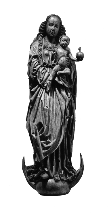 Maria is staande voorgesteld en rust op haar linkerbeen. Zij staat op de bolle maan waaruit aan weerszijden de punten van de maansikkel steken. Haar rechterbeen is een weinig naar voren geschoven. Het naakte Christuskind zit op haar rechterhand, op een slip van haar mantel. Zij steunt het met haar linkerhand. De kleine Christus houdt ...
