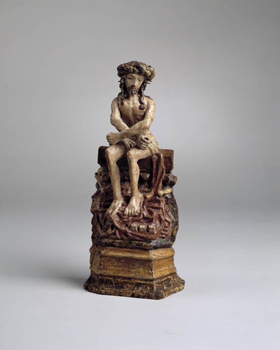 Christus zit met gekruiste en gebonden armen op een balk, die op een rotsachtige verhevenheid is gelegen. Zijn handen rusten op zijn bovenbenen. Zijn voeten rusten op zijn mantel die aan zijn linkerzijde van de balk is afgegleden en de ondergrond in plooien bedekt. Hierop liggen de dobbelstenen, waarmee de soldaten zullen dobbelen om het ...