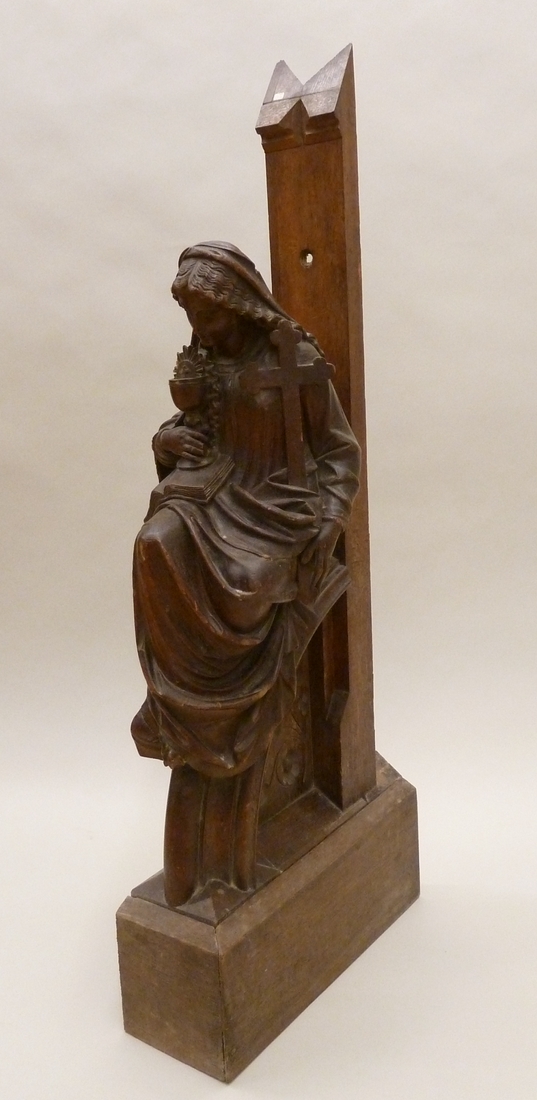 De vrouwenfiguur is zittend voorgesteld. Zij draagt in haar rechterhand een evangelieboek, waarop een kelk met stralende hostie staat. In haar linkerhand houdt zij het kruis. Zij is gekleed in een lang gewaad en een mantel die over haar hoofd is geslagen. Ze zit op een architectuurfragment in de vorm van een geprofileerde boog. In ...