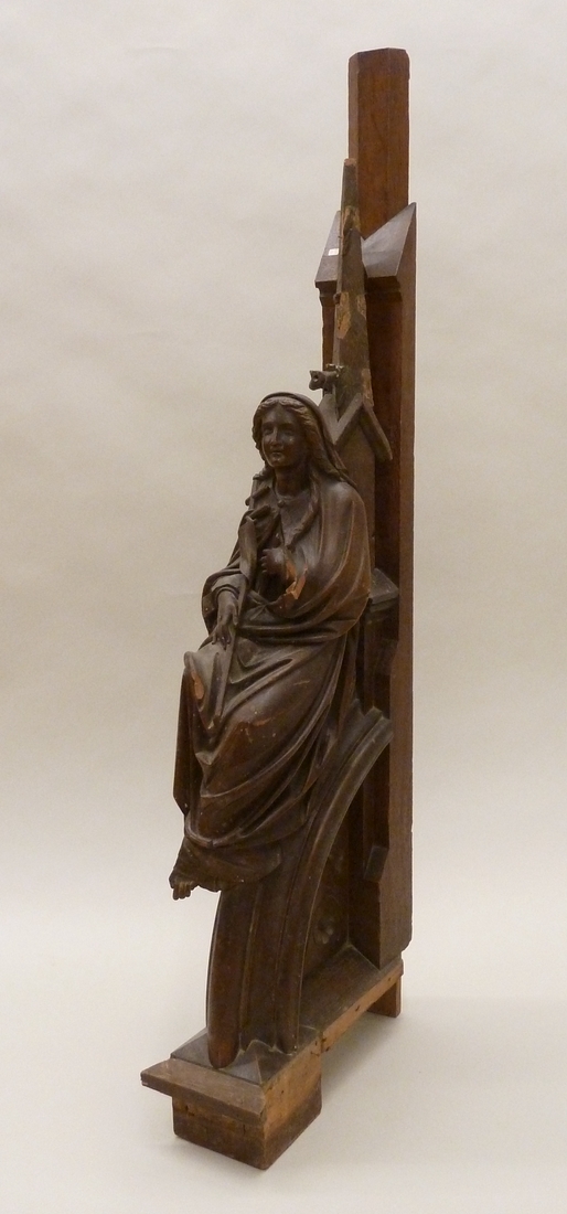 Ecclesia; zittende vrouwenfiguur met kruisvaan, van preekstoel