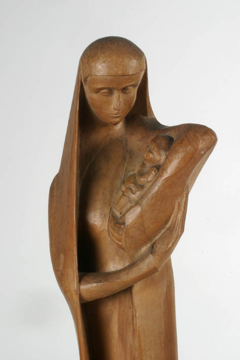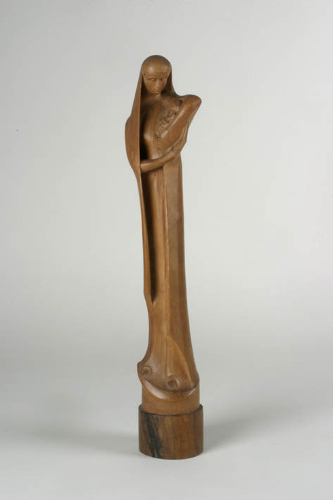 Maria is staande voorgesteld. Zij is gekleed in een lang gewaad, dat de voeten vrijlaat. Eroverheen draagt zij een mantel, die tevens over haar hoofd is geslagen. Maria draagt het kind in de holte van haar linkerarm en heeft haar blik op het kind gericht. Zij staat op een grond. Het geheel staat op een ...