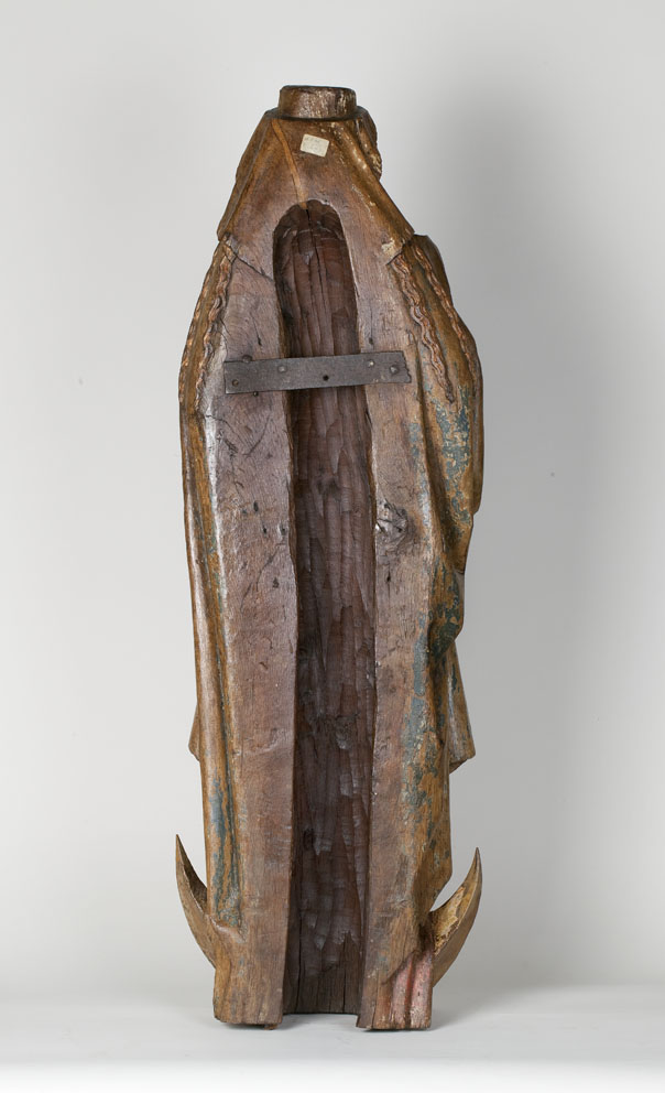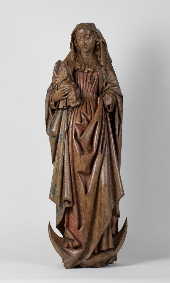 Maria staat op de maansikkel, die aan de onderzijde wordt omkranst door gestileerde wolken. Zij draagt het met gekruiste benen, naar rechts zittende Christuskind op haar rechterarm. Het kind houdt met zijn linkerhandje de uiteinden van het koord vast, waarmee Maria's mantel is gesloten. Maria heeft haar wijde mantel vastgezet onder het kind, zodat de ...