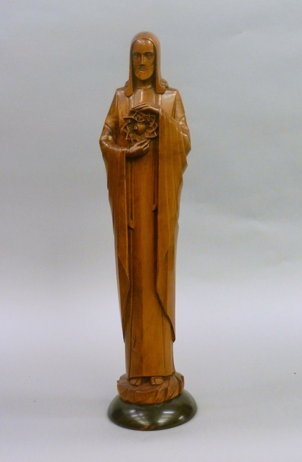 Christus is staande voorgesteld. Hij houdt een doornenkroon met beide handen voor zijn borst. In de doornenkroon een bloedend hart, omgeven door een stralenkrans en bekroond door een kruis. Christus is gekleed in een lang gewaad met zeer wijde mouwen en daaroverheen een mantel. Hij staat op een cirkelvormige grond met schuine inkepingen. De sokkel, ...